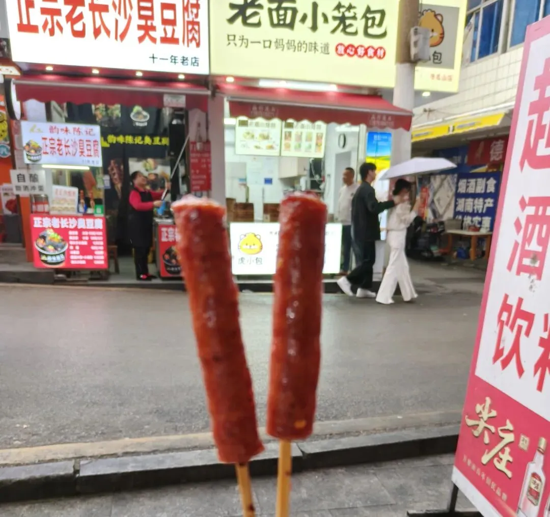 还有火遍长沙的冬瓜山烤肠,油滋滋的两根串在竹签上,烤得焦香四溢,刷上秘制辣酱,咬一口肉香满满,咸香带辣,边走边吃,逛吃的快乐直接拉满。