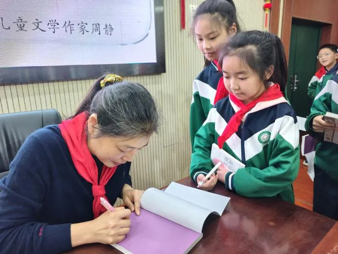 美好的时光总是短暂,活动在温馨的合影留念中落下帷幕。孩子们簇拥着周静老师,用镜头定格下与名家相遇的珍贵瞬间,这份温暖的记忆,将成为童年里最闪亮的光。活动最后,周静老师还为孩子们举行了温馨的亲笔签名会,一本本带着墨香的书籍、一张张精致的书签,在作家温柔的笔触下,留下了最珍贵的鼓励与祝福。
