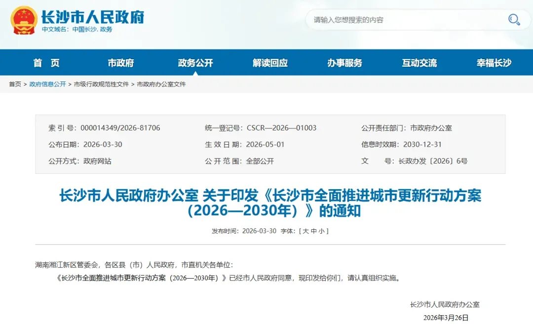 《长沙市全面推进城市更新行动方案(2026—2030年)》已经市人民政府同意,现印发给你们,请认真组织实施。