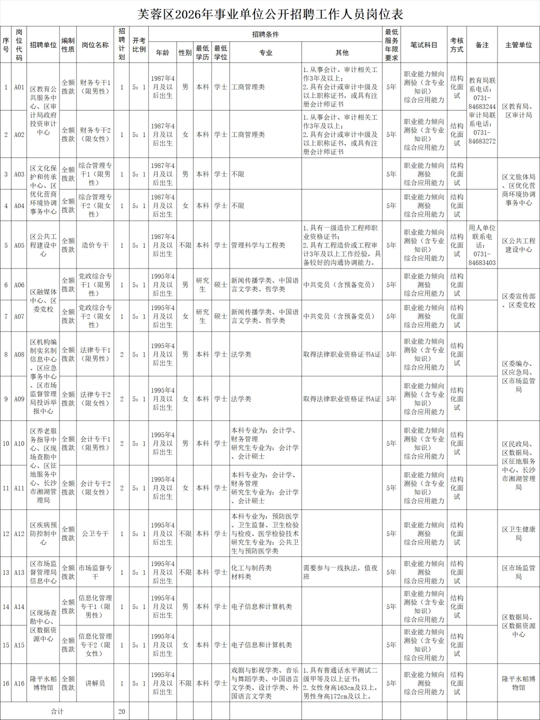 此次招聘岗位16个,招聘计划20名,详见附件1:《芙蓉区2026年事业单位公开招聘工作人员岗位表》
