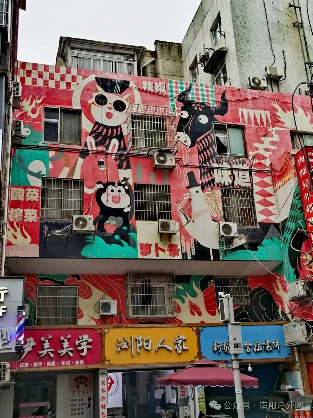 长沙人的早晨是从一碗热腾腾的米粉开始的,若是有一条街汇聚了湖南14市州的特色米粉。那可真是让人大饱口福啦!巨大的青花瓷碗和一束飞扬的米粉造型,让整条街更加生动鲜活,潮流画作和夸张的小龙虾元素。在具有年代感的老街区停留,潮流与复古在这里碰撞。
