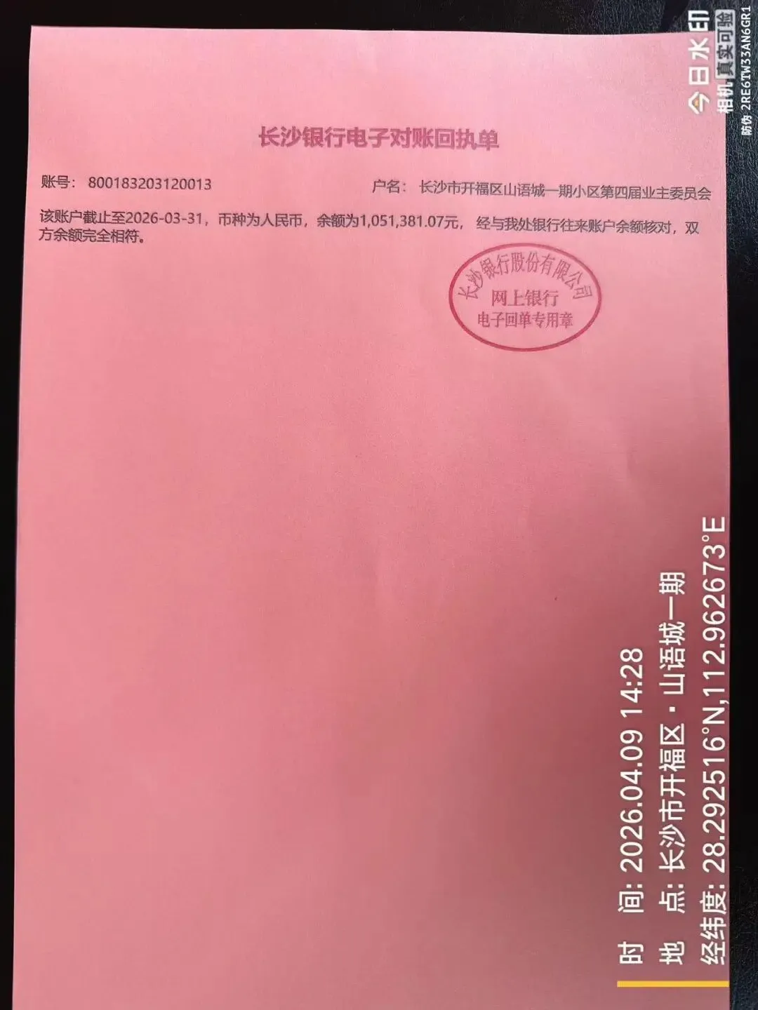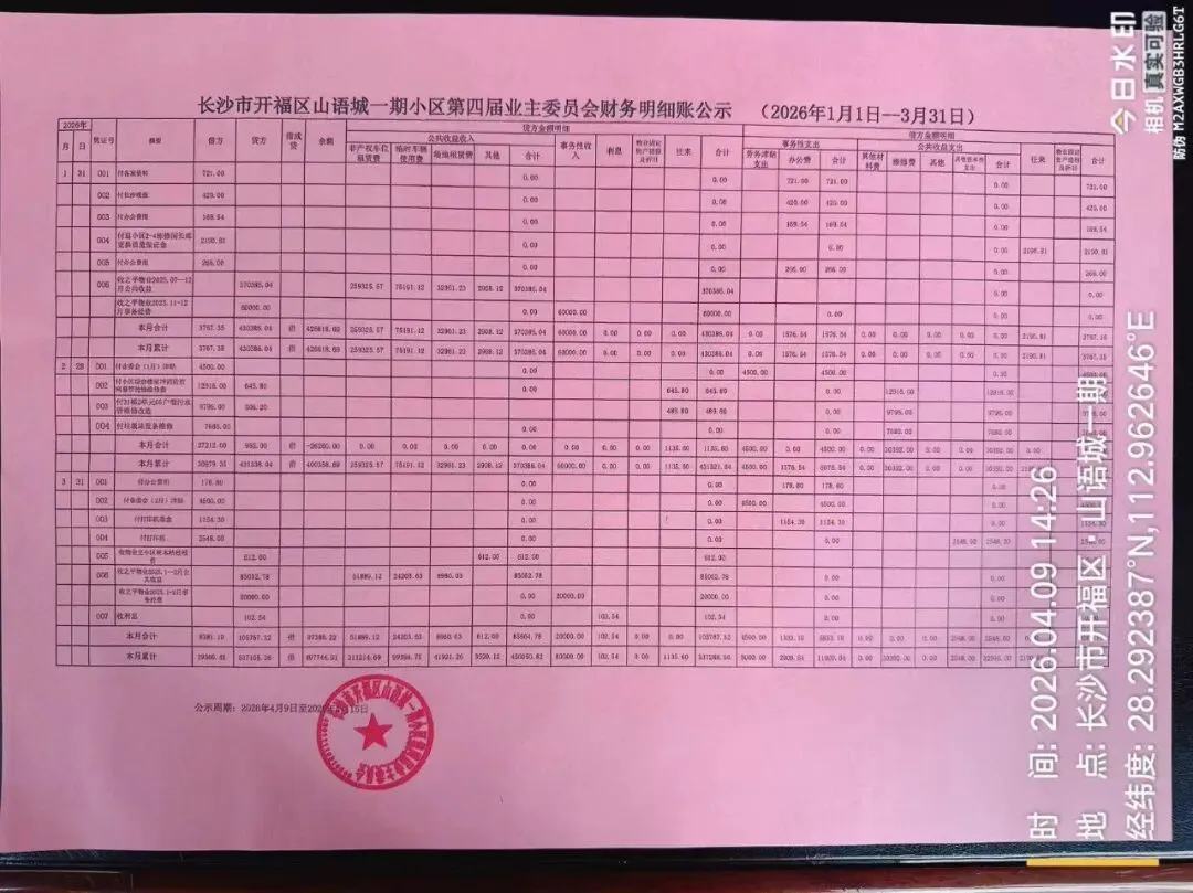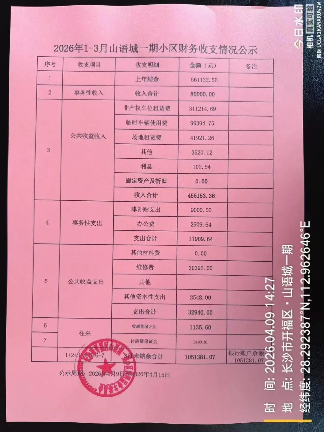 长沙市开福区山语城一期小区2026年1月至3月31日止,小区公共收益账户余额为:1051381.07元;具体明细、收支情况、总账及银行账户余额见张贴到小区各楼栋门厅及小区公告栏公告。