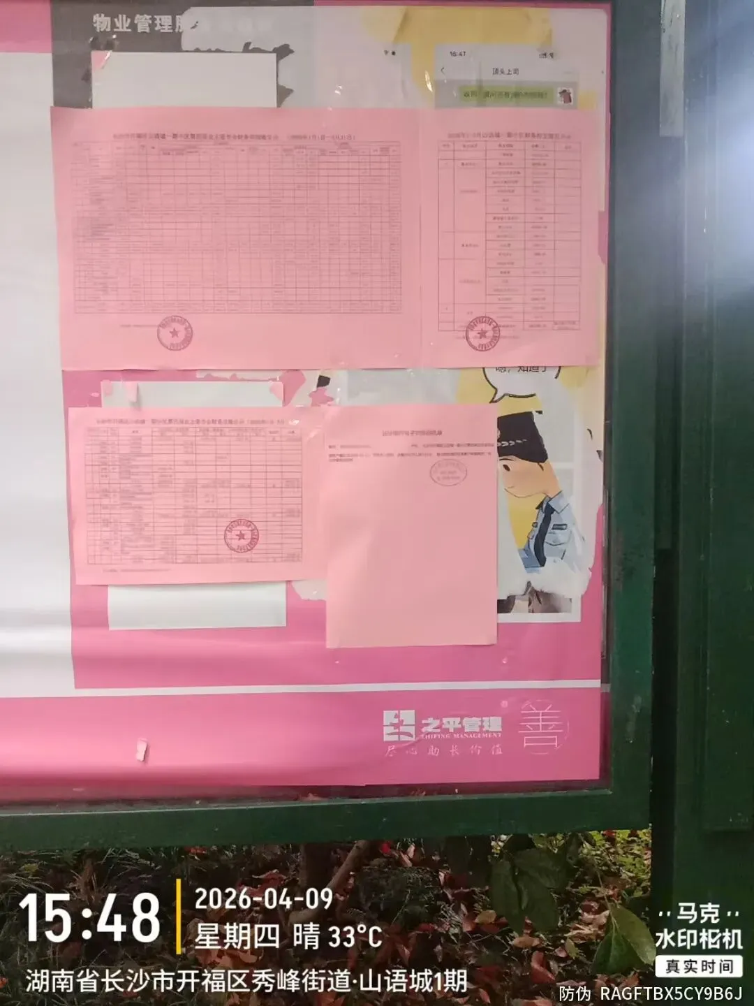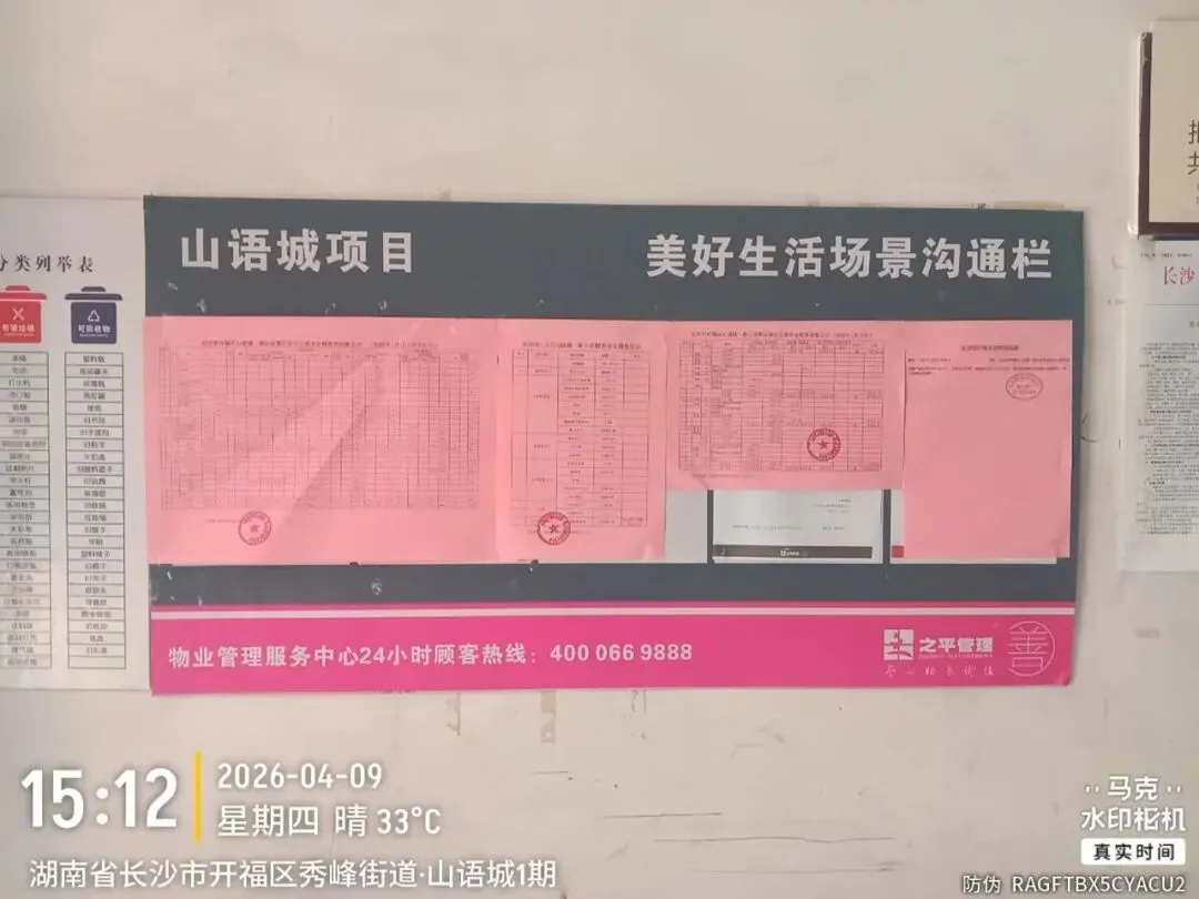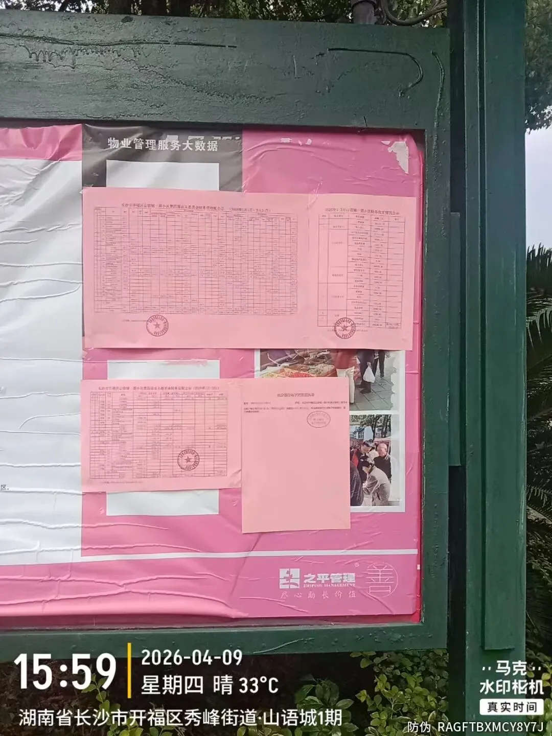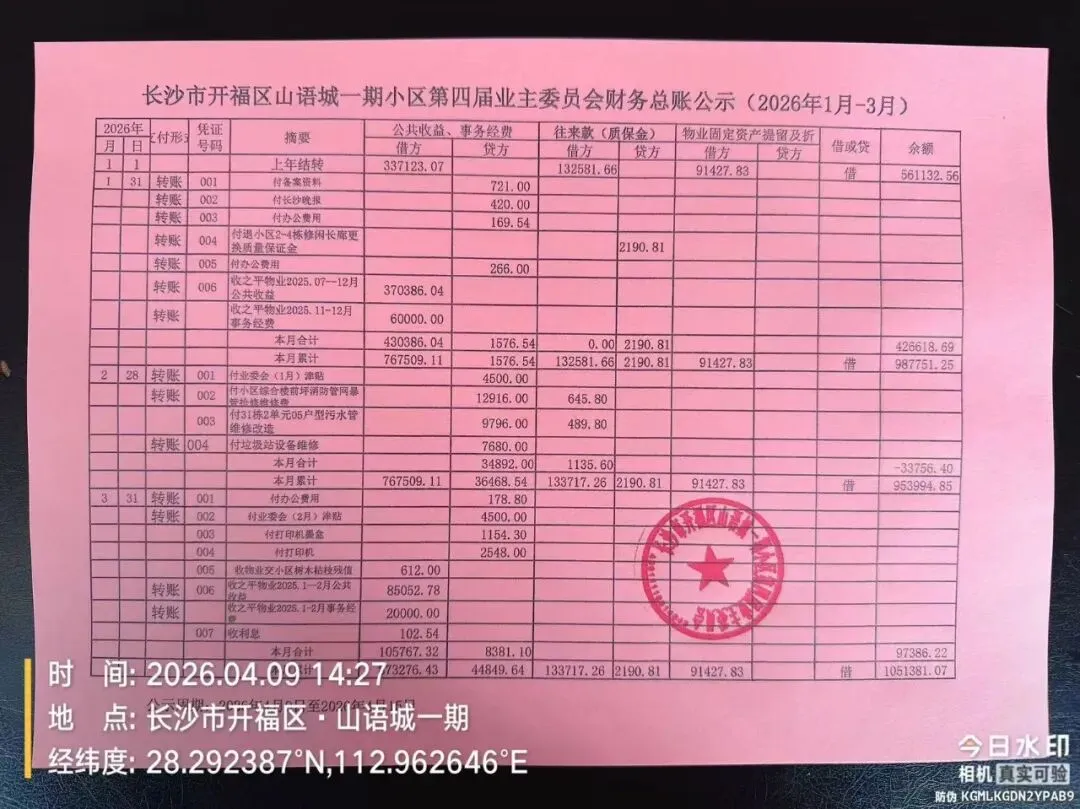 长沙市开福区山语城一期小区2026年1月至3月31日止,小区公共收益账户余额为:1051381.07元;具体明细、收支情况、总账及银行账户余额见张贴到小区各楼栋门厅及小区公告栏公告。