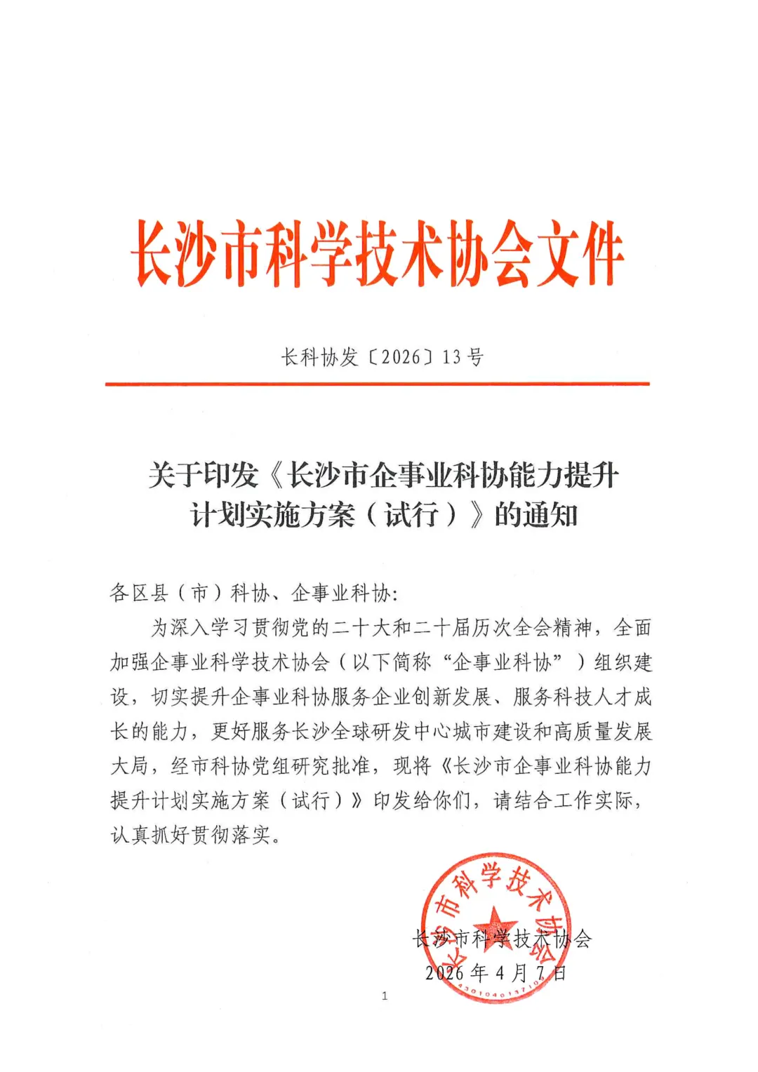 >关于印发《长沙市企事业科协能力提升计划实施方案(试行)》的通知