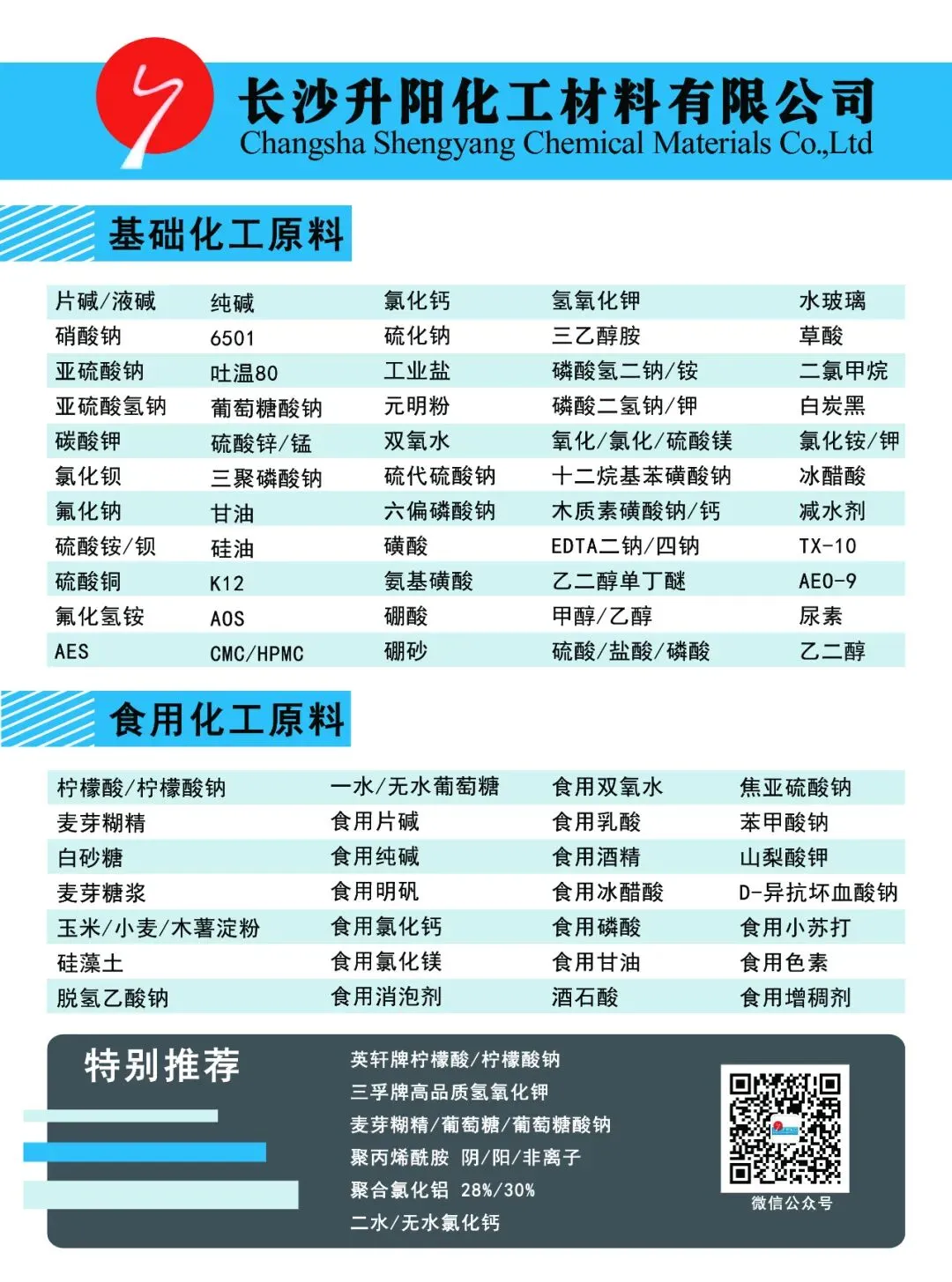 资质齐全,靠谱有保障:拥有危险化学品经营许可证、食品经营许可证等全套资质,荣获长沙化工协会理事单位等多项荣誉,口碑评分高达9.8/10。现货充足,无需等待:近5000㎡仓库,300+种化工产品常备,库存量超3000吨,核心品类现货直达,解决“有价无货”痛点。一手货源,价格优势:与国内外知名化工企业长期战略合作,源头直采无中间商,保证产品质量的同时,提供具竞争力的价格。物流高效,配送便捷:自备运输车辆,覆盖湖南及周边区域,核心区域当日或次日达,规避运费上涨额外成本。专业服务,全程无忧:专业化工团队,提供现场技术指导、定制化采购方案,售前、售中、售后全程跟进。温馨提示:当前化工多品类联动涨价,柠檬酸、葡萄糖、氨基磺酸、焦亚硫酸钠、亚硫酸氢钠等刚需产品涨势明显,厂家封盘频繁,建议有采购需求的伙伴提前锁定货源,长沙升阳化工现货稳供,助力规避价格波动风险!深耕化工赛道16年,长沙升阳化工以“服务至上,以诚为本”,专注为企业提供优质、便捷、高性价比的化工原料采购服务,在售产品覆盖多领域,现货直达、全程护航。如果您有采购需求、想了解具体产品报价,或是需要适配自身行业的定制化采购方案,欢迎评论区留言、私信咨询,长沙升阳化工专业团队为您一对一解答,助力您省心采购、降本增效🌊📞 咨询通道: