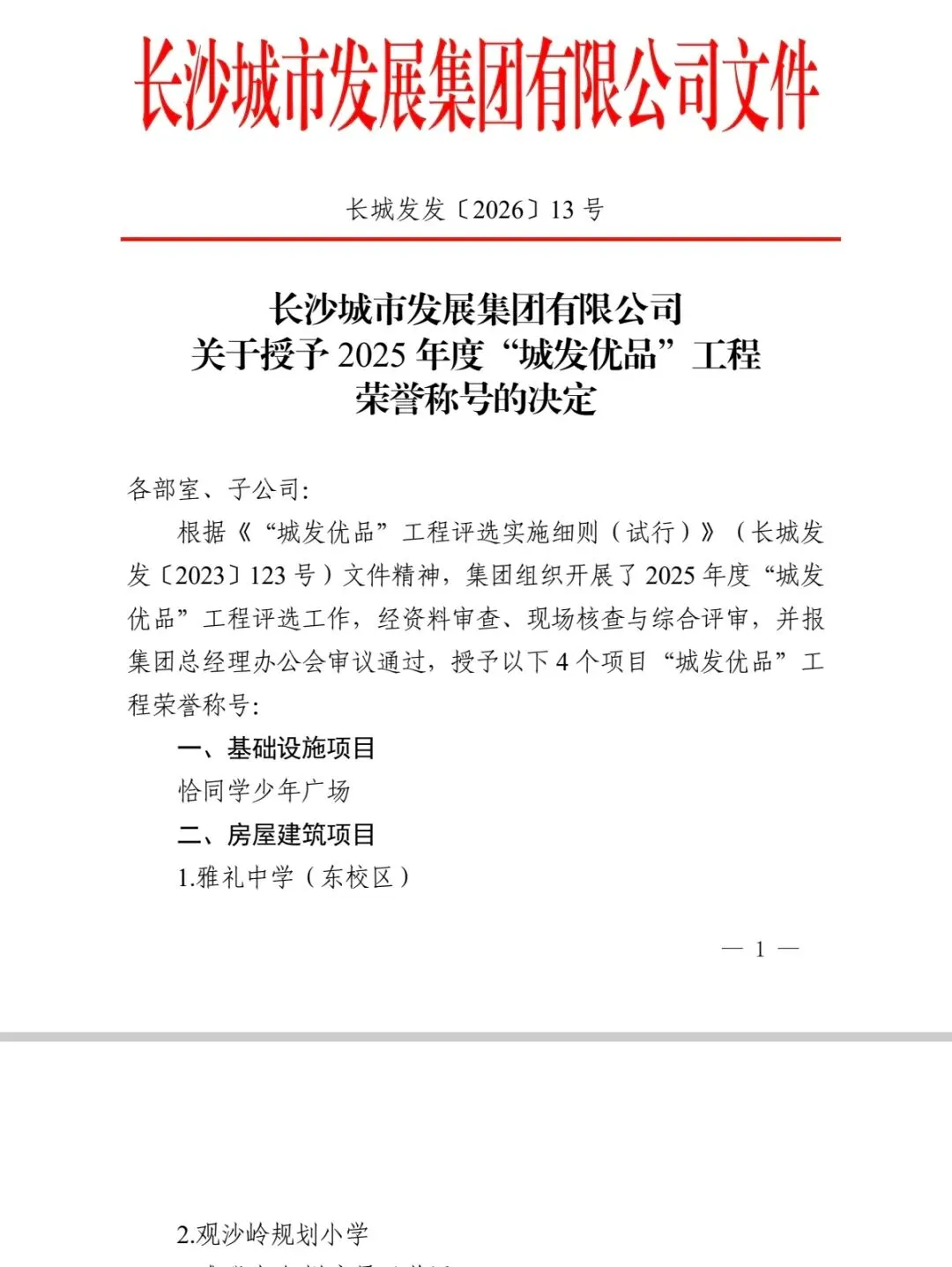 项目自开工以来,已先后获评“长沙市结构优良工程”“湘江新区建设项目大气污染防治‘A级工地’”“2024年下半年湖南湘江新区建筑施工绿色工地”“湘江新区首届清廉建设示范项目”“湖南建投集团2024年度‘十佳’项目部”等多项荣誉。