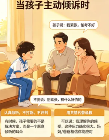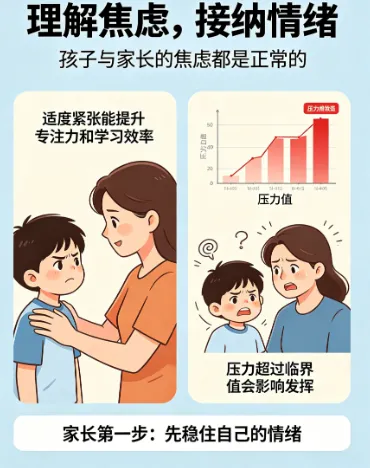- 可以说:"我理解你的感受,这种压力确实很大。妈妈/爸爸相信你能应对。"