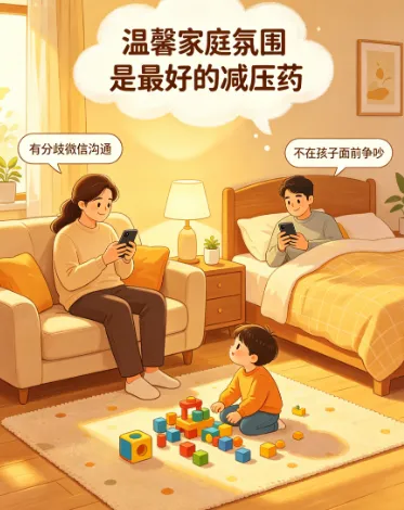如果有分歧,用微信沟通,不要在孩子面前争吵。温馨的家庭氛围是最好的"减压药"。