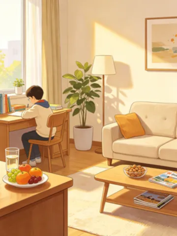 在书桌旁放一杯温水、一盘水果;客厅茶几上放孩子喜欢的坚果、杂志。