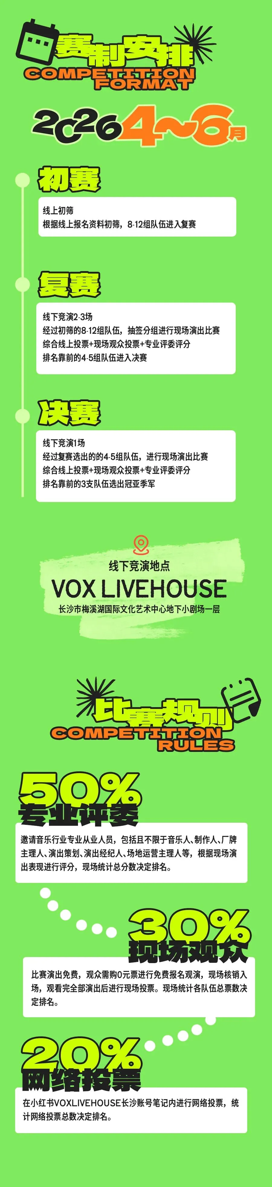 初赛计划选拔8-12组选手进入复赛,经过2场线下展演复赛和1场线下展演决赛,决出2026年湖南高校寻声计划冠军、亚军、季军与本年度后续演出、作品录音制作等计划。