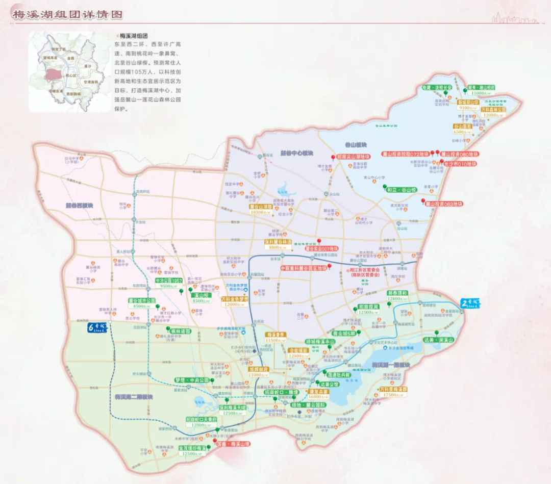 梅溪湖组团作为国家级湘江新区的核心板块,集生态、教育、科创、商业于一体,定位高端宜居,是长沙改善置业的热门板块,依托超级中轴规划,价值持续升级。