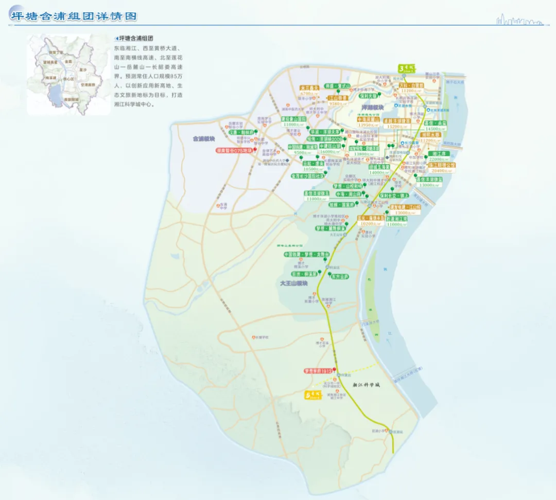 片区内地铁3号线已通车,大王山云巴线串联各大景点,五横三纵主干路网畅达全城,交通便利。目前板块内两极分化明显,含浦板块主打刚需,洋湖板块主打刚改与改善。