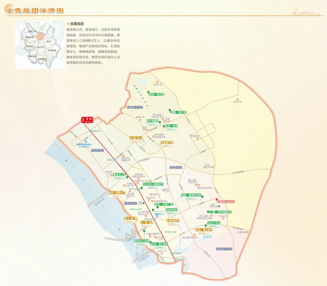 是长沙十大重点片区之一“金霞新城”的核心生活圈,依托芙蓉北路、北二环等交通主轴,集生态、产业、居住于一体,近期商业与交通配套持续升级,成为改善与刚需兼顾的潜力板块。