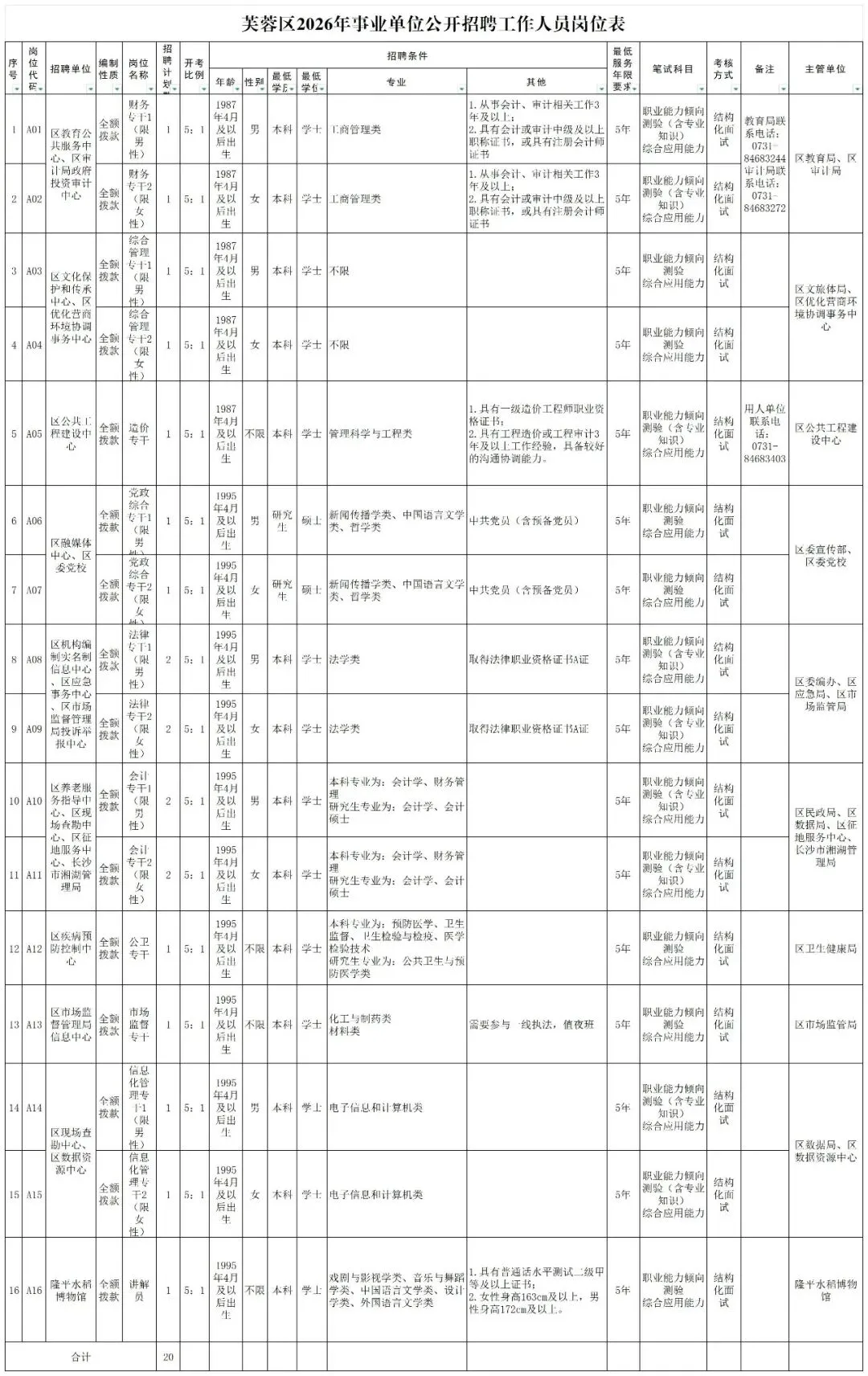 根据《事业单位人事管理条例》(中华人民共和国国务院令第652号)、《湖南省事业单位公开招聘人员办法》(湘人社规〔2025〕1号)等有关规定,结合我区工作需要,经研究,决定面向社会公开招聘事业单位工作人员20名。现将有关事项公布如下: