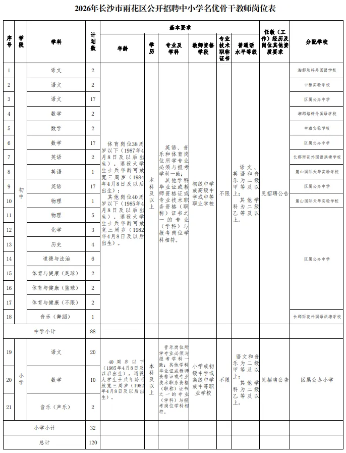 根据《事业单位人事管理条例》(国务院令第652号)、《关于进一步做好事业单位公开招聘工作的通知》(人社部发〔2024〕57号)和《湖南省事业单位公开招聘人员办法》(湘人社规〔2025〕1号)等有关规定,经研究决定,面向社会公开招聘中小学名优骨干教师120名(其中初中教师88名、小学教师32名)。现将有关事项公布如下: