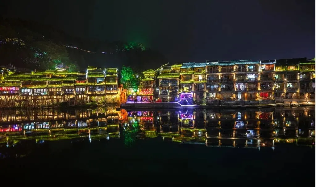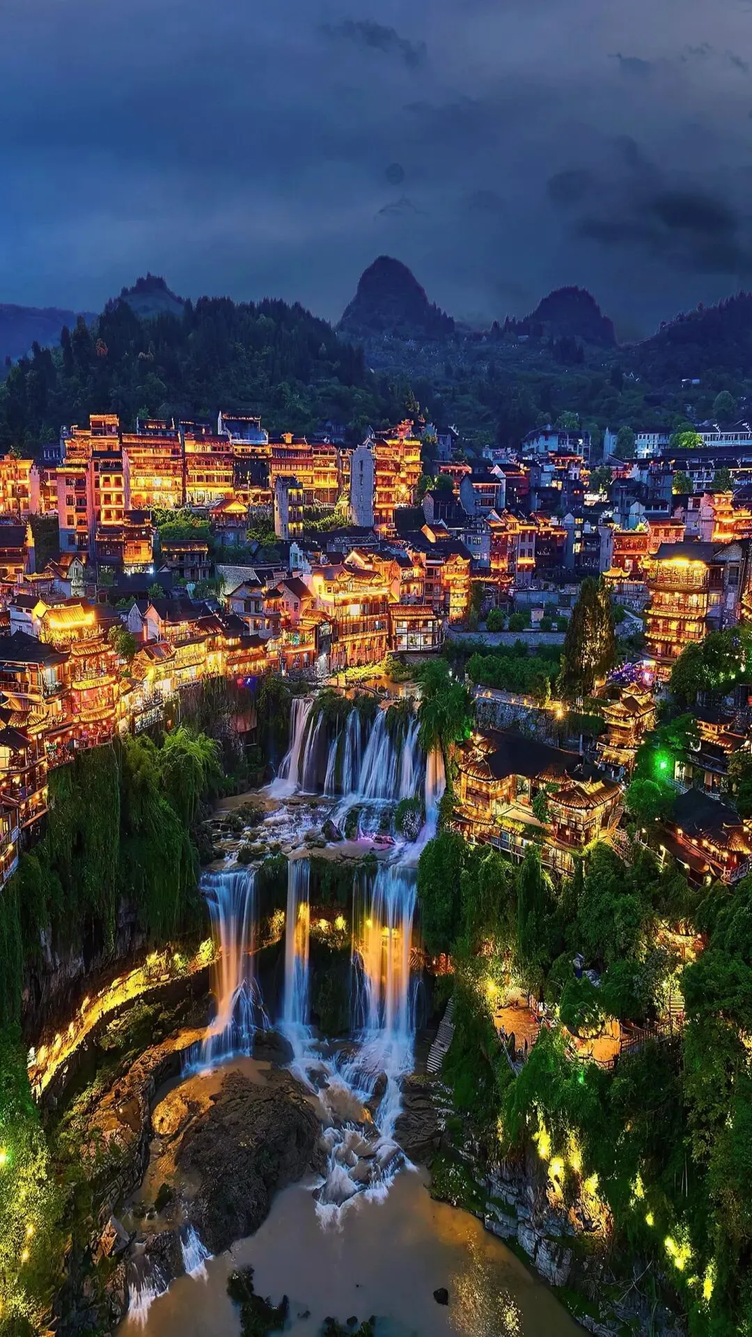 夜晚的芙蓉镇是另一番景象,灯光将瀑布和吊脚楼照亮,水流在灯光下泛出蓝色和金色的光。坐在观景台上喝茶,听水声如雷,看远处群山隐入夜色,山野与古镇在这里浑然一体。