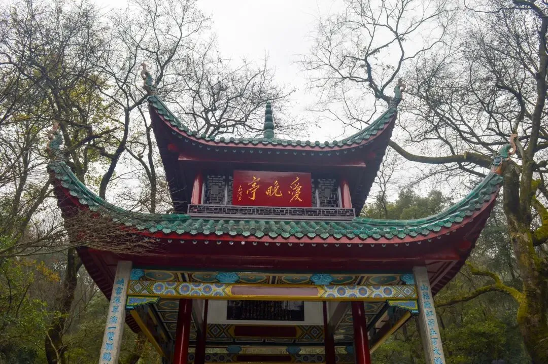 从岳麓山东侧进入,步行约十分钟便到爱晚亭。这座亭子的名气,很大程度上来自杜牧那首《山行》。诗人写的是深秋山景,但亭子一年四季都有看头。亭身为方形,花岗岩石柱,顶覆绿色琉璃瓦,檐角向上翘起,姿态轻盈。亭内横匾上“爱晚亭”三字,是毛泽东青年时代题写。