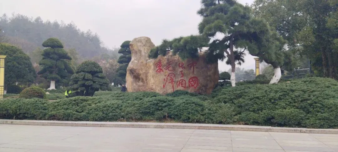 广场入口处,形似中国地图的“中国石”,上面鲜红的8个大字:“中国出了个毛泽东”,当代中国书法家泰斗沈鹏题写。