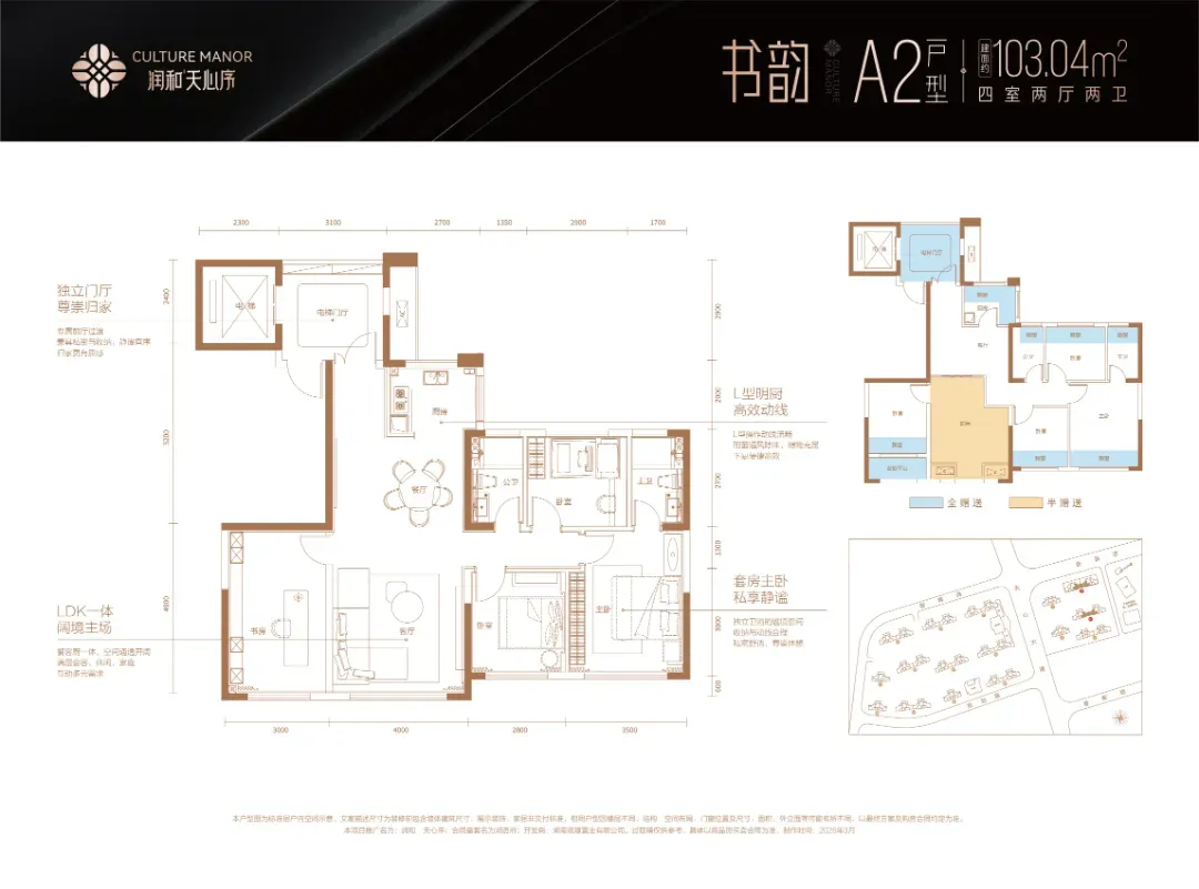 润和天心序:户型建面约100㎡起,四房两厅两卫。主打一个控制总价,功能齐全。