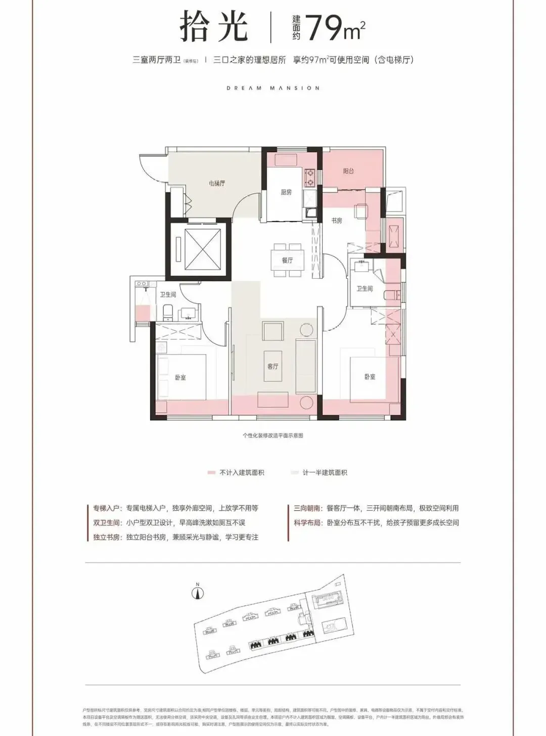 梦想学府1912:建面约79㎡的三房户型,独梯入户、约3.6m客厅开间、三开间朝南、得房率约123%(含电梯厅),实际可得面积约97㎡。(学区划分,以正式文件公示为准)