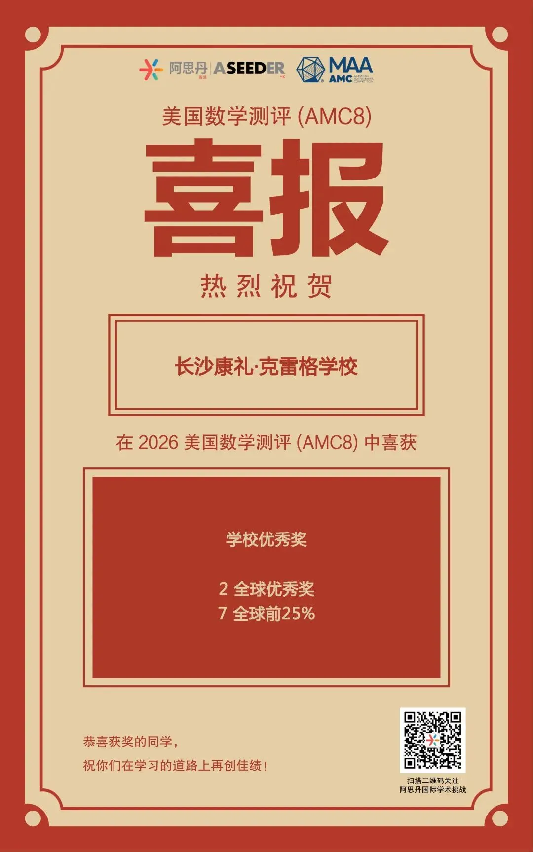 美国AMC8:2人跻身全球TOP5%,7人获得全球前 25%,学校荣获“优秀学校奖”;