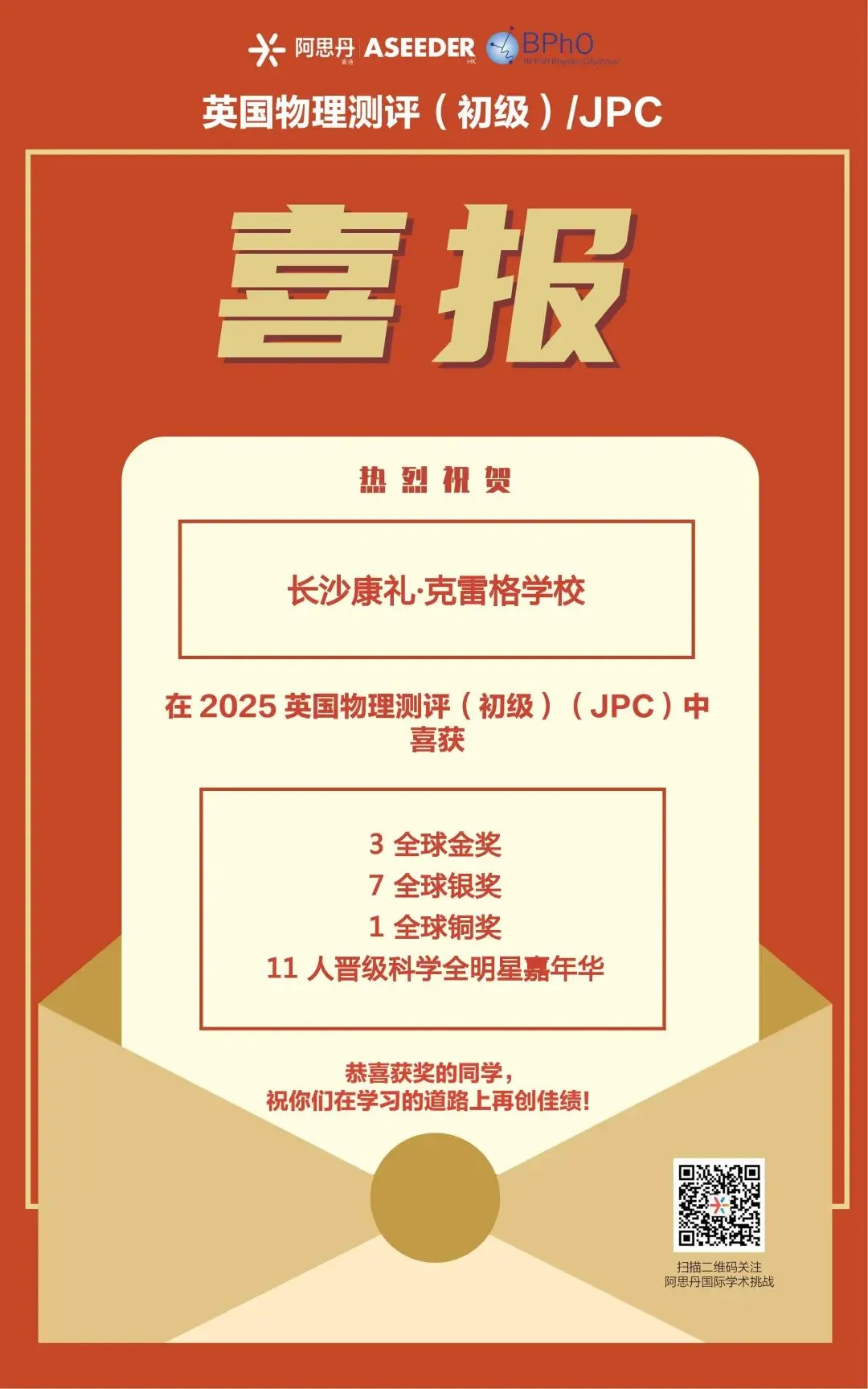 学期初,2025年英国物理测评(初级)(JPC)与2026年英国物理测评(中高级)(IPC&SPC Online)成绩相继公布。长沙康礼·克雷格学校初中部学子在两场国际物理竞赛中表现优异,载誉而归。