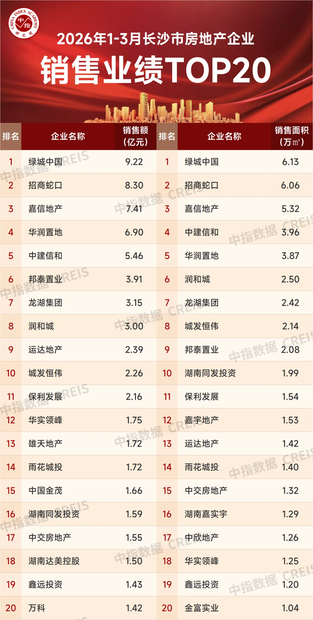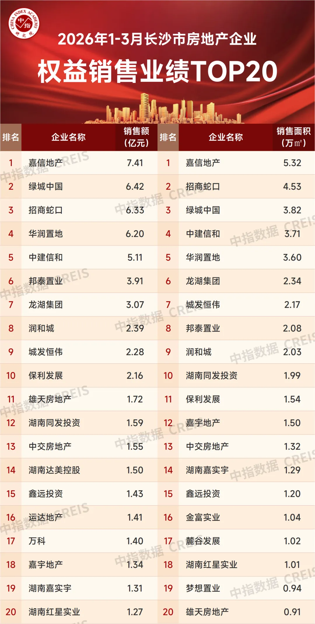 特别声明:房地产企业销售数据统计是以2026年1月1日-3月31日期间销售的商品房为统计口径,主要依据中指数据CREIS(点击查看)在长沙市内六区的销售监测数据,并参考企业提供的相关数据,经课题组严格审核纳入统计,涉及合资项目,销售数据划归于操盘企业。本报告仅供参考,课题组不对使用报告及其内容所引发的任何直接或间接损失承担责任。