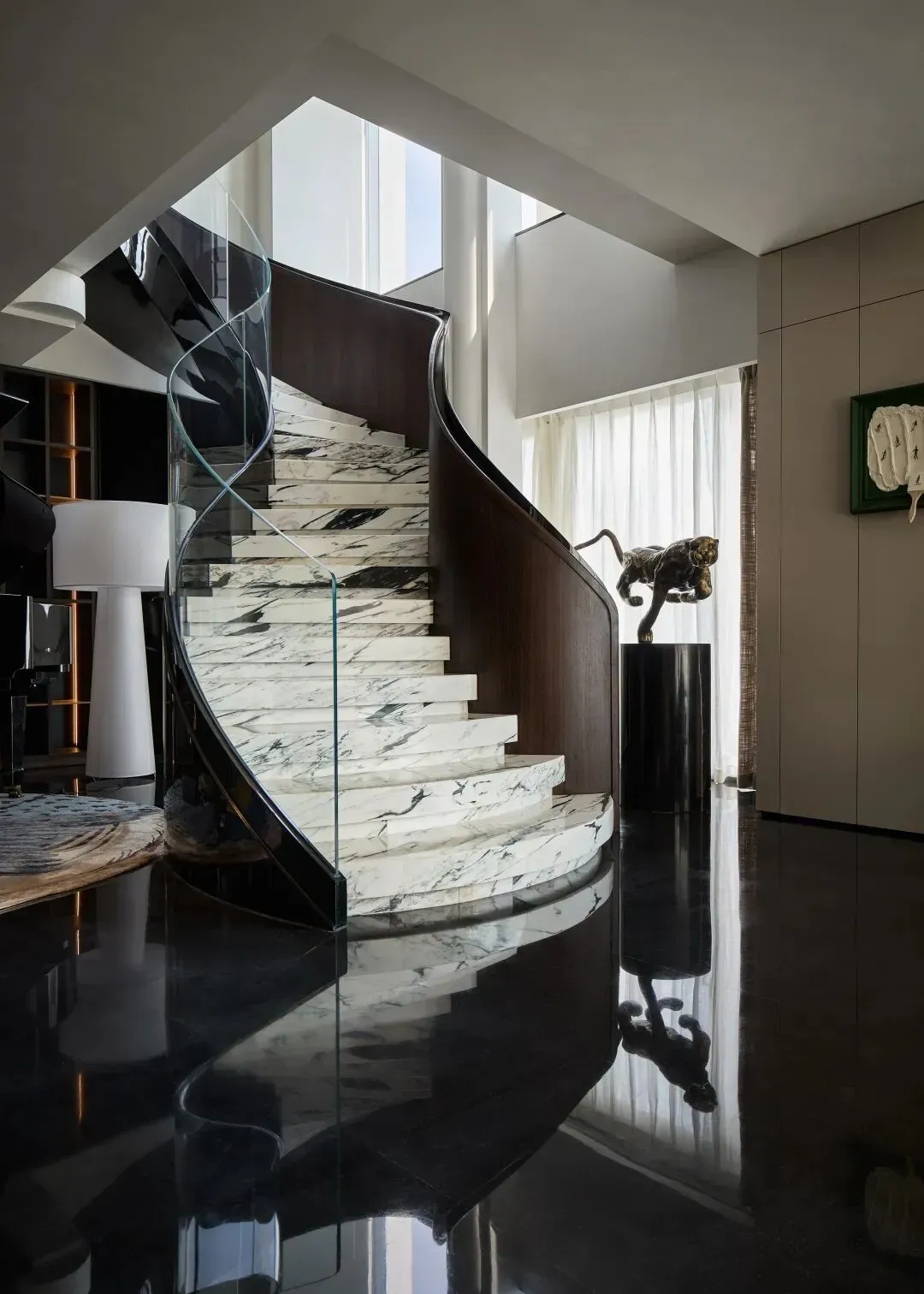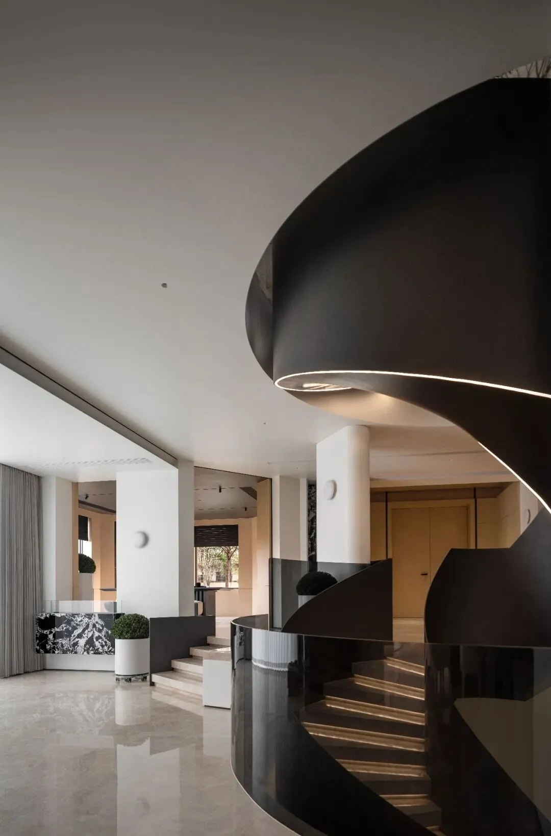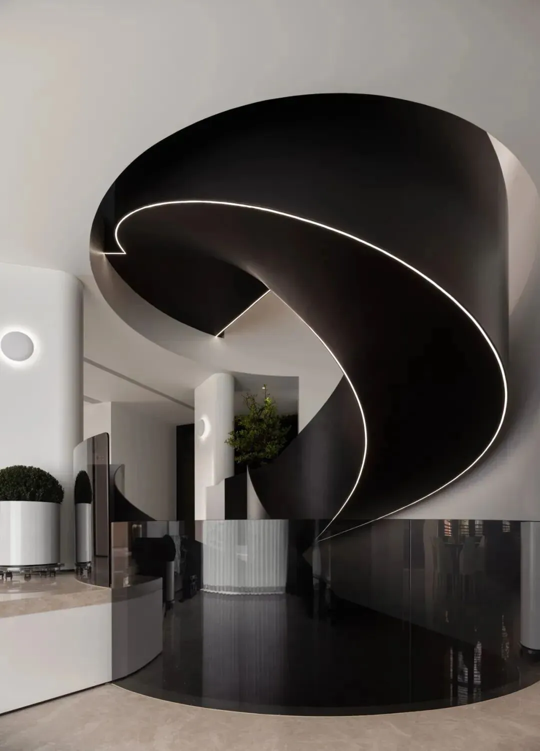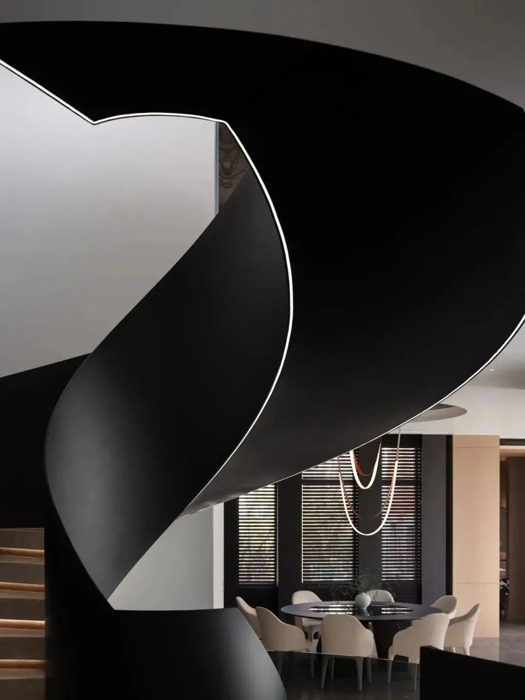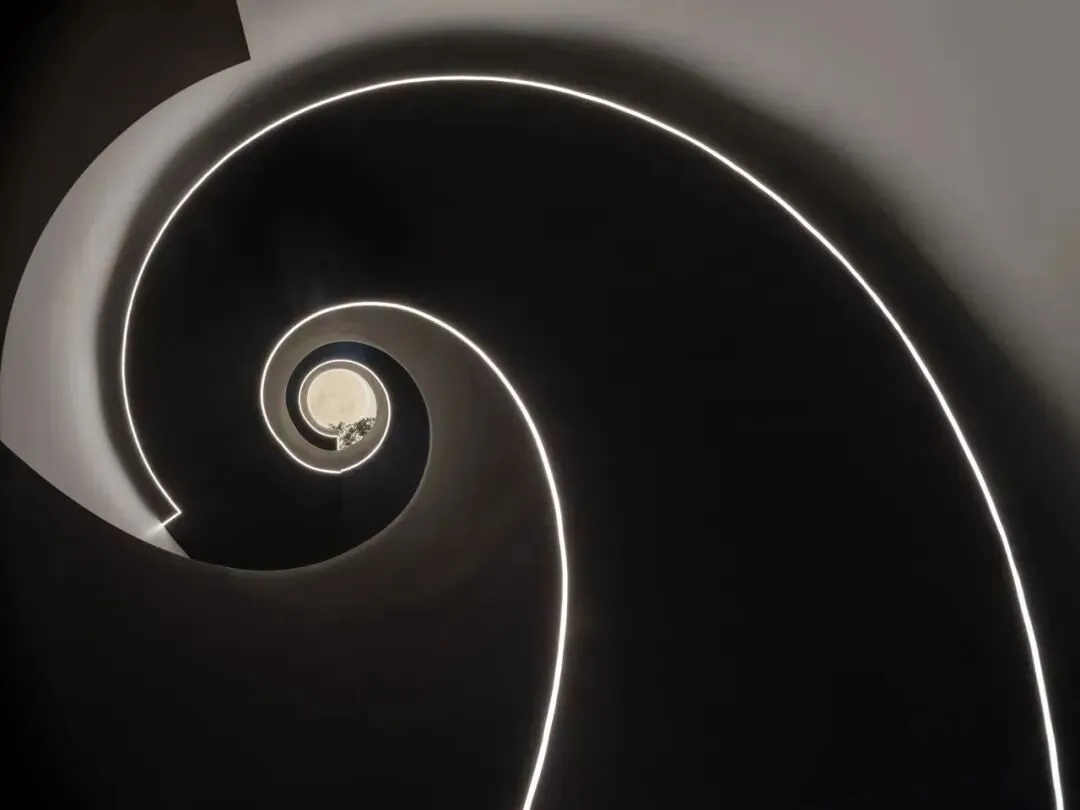 入户礼序区以旋转楼梯作为视觉与功能的中枢,串联上下各层。楼梯采用黑白交织的螺旋曲线,嵌入式灯带沿轮廓延展,从底部贯穿至顶层,每一步都带动光影的渐变。