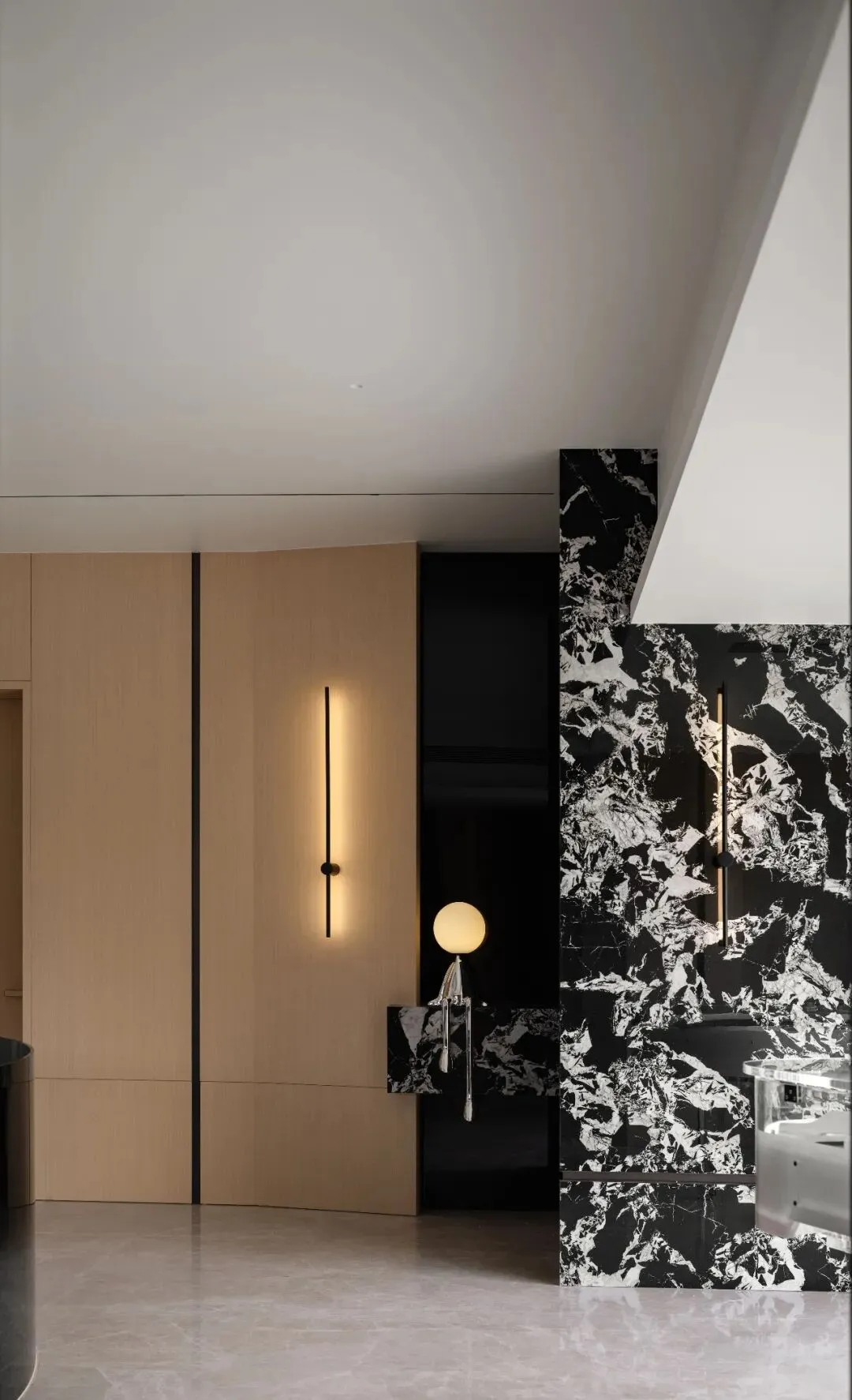 空间用材:烟熏木饰面、银梨木饰面、岩板、涂料、现代灰大理石空间摄影:史云峰