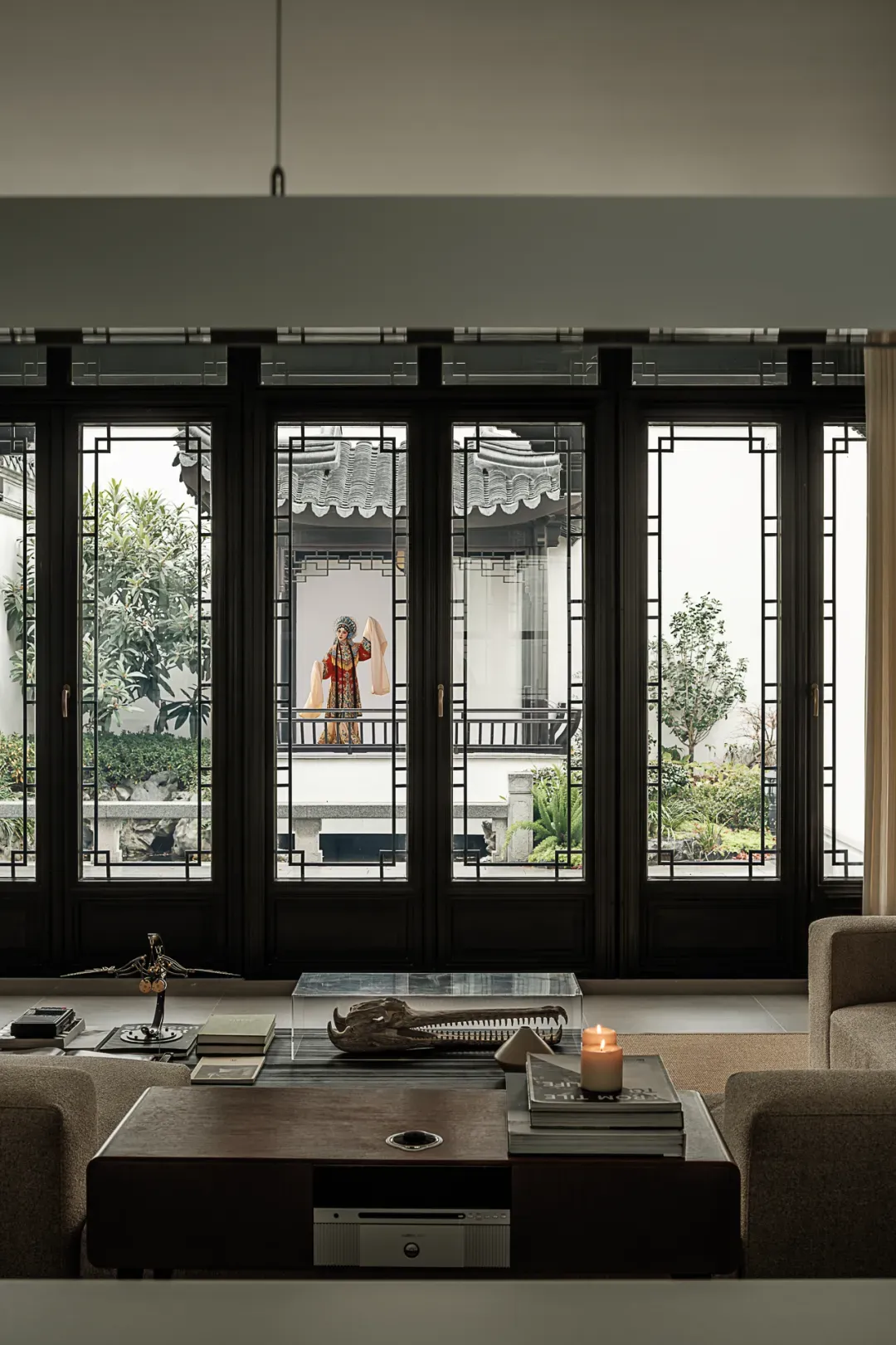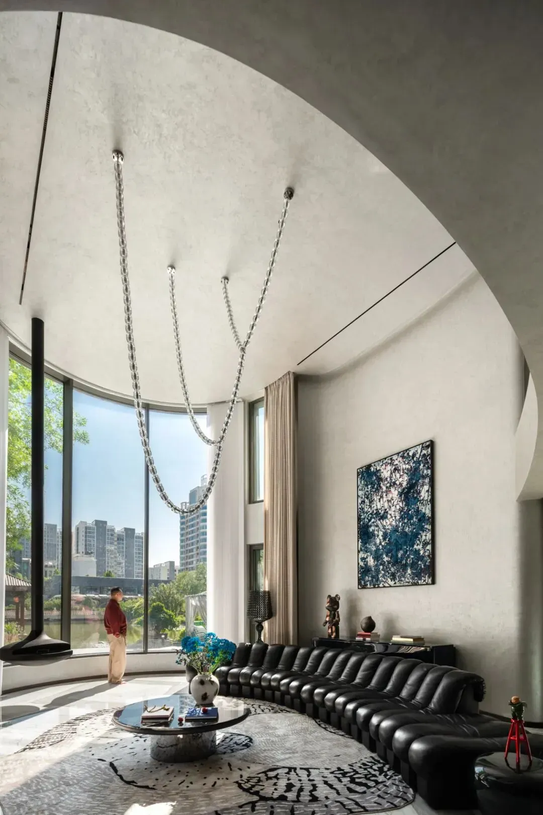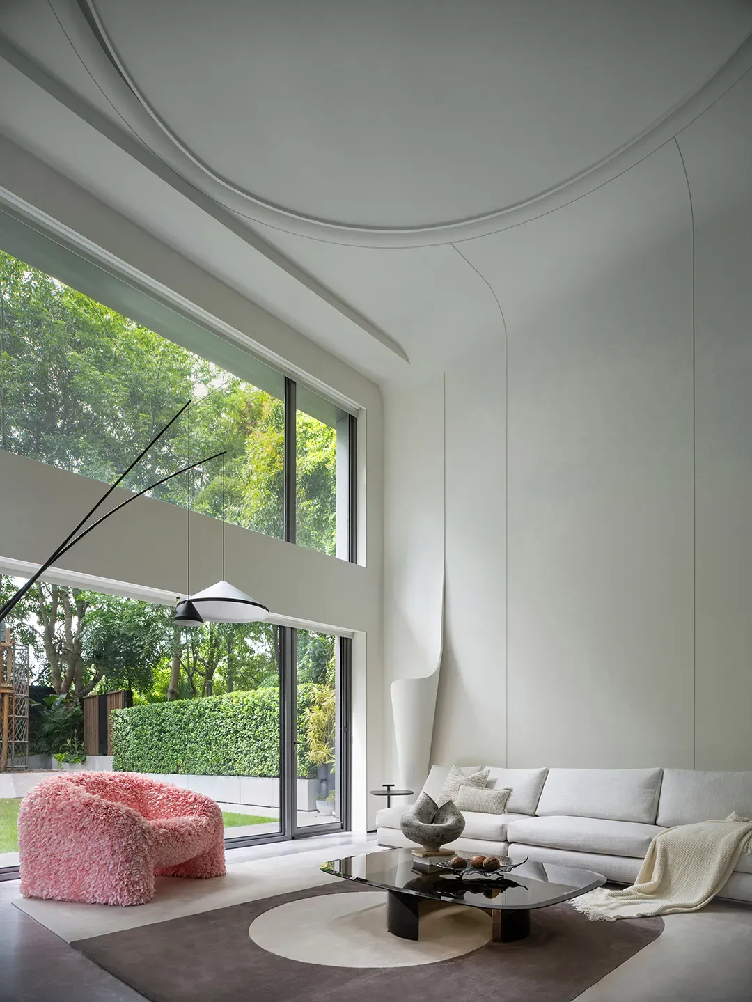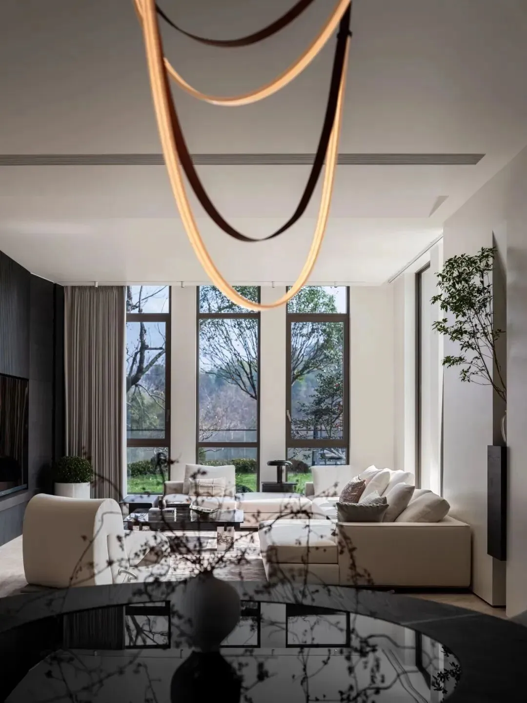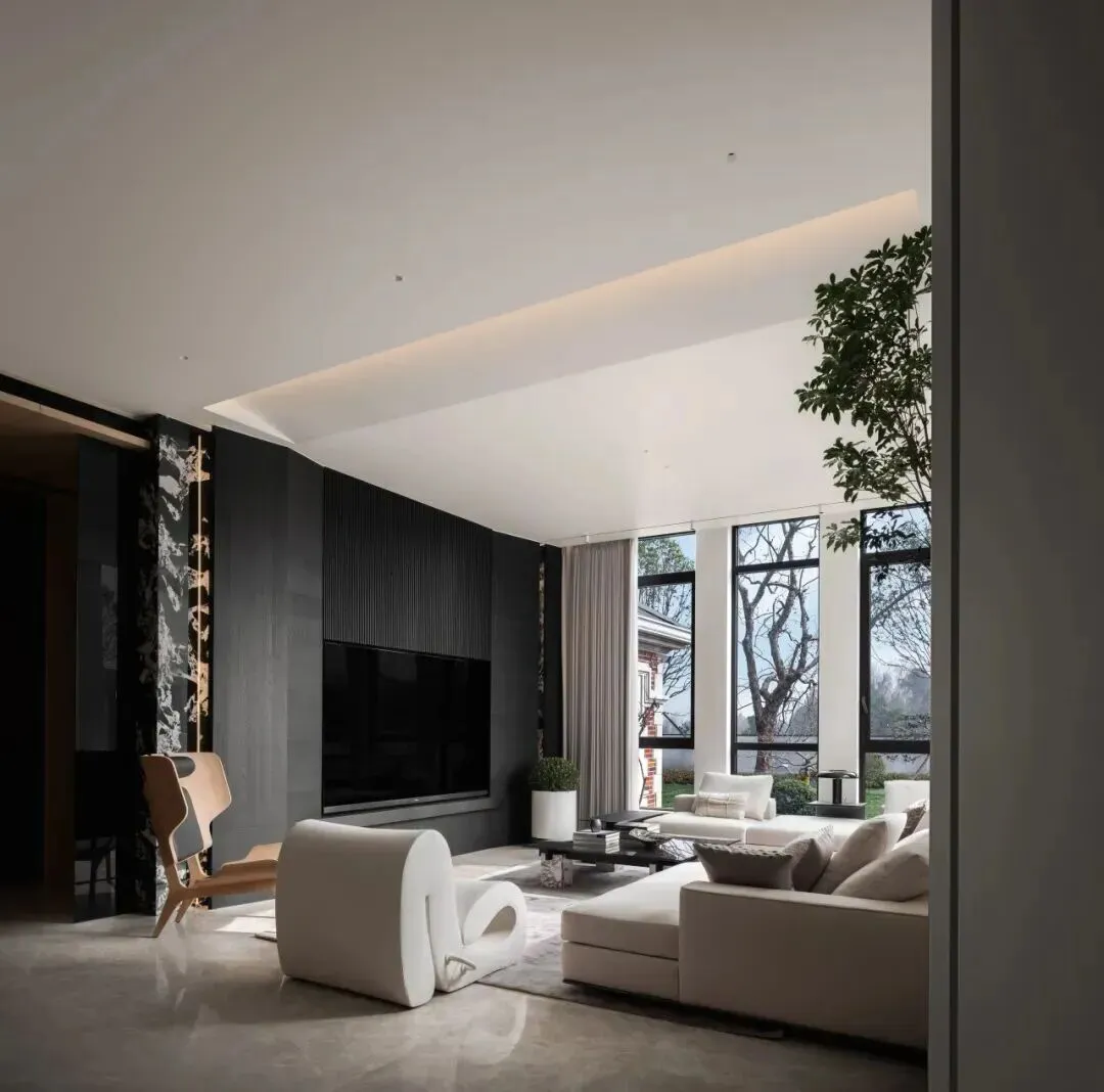 背景墙采用黑色百叶窗调节光线,两侧黑白纹理饰面与木质线条形成对比,既提升精致感,又为家庭用餐与宴请营造仪式与私密并存的氛围。客厅采用挑高设计,全景落地窗将庭院的绿意和天光引入室内;浅色软装与空间底色协调,曲线造型的吊灯成为亮点,黑白撞色的艺术摆件点缀其间,让极简空间在光影变化中既有日常的松弛,也不失待客的礼仪。