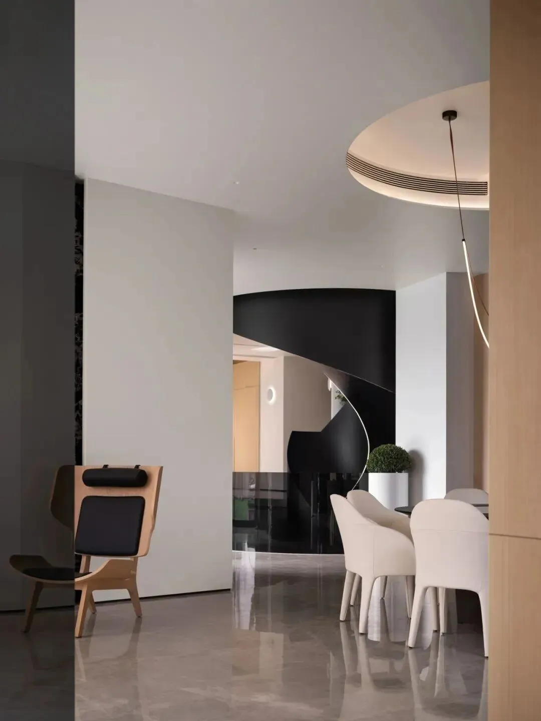 从高处看,楼梯形似展开的螺钿,与下方弧形黑色台面形成对话,成为空间中的视觉地标。玄关延续沉静基调,穹顶设有圆月形光饰,配以苍翠植物,开门即呈现东方留白意境,迅速消解外界嘈杂,引导人缓慢进入室内深处。