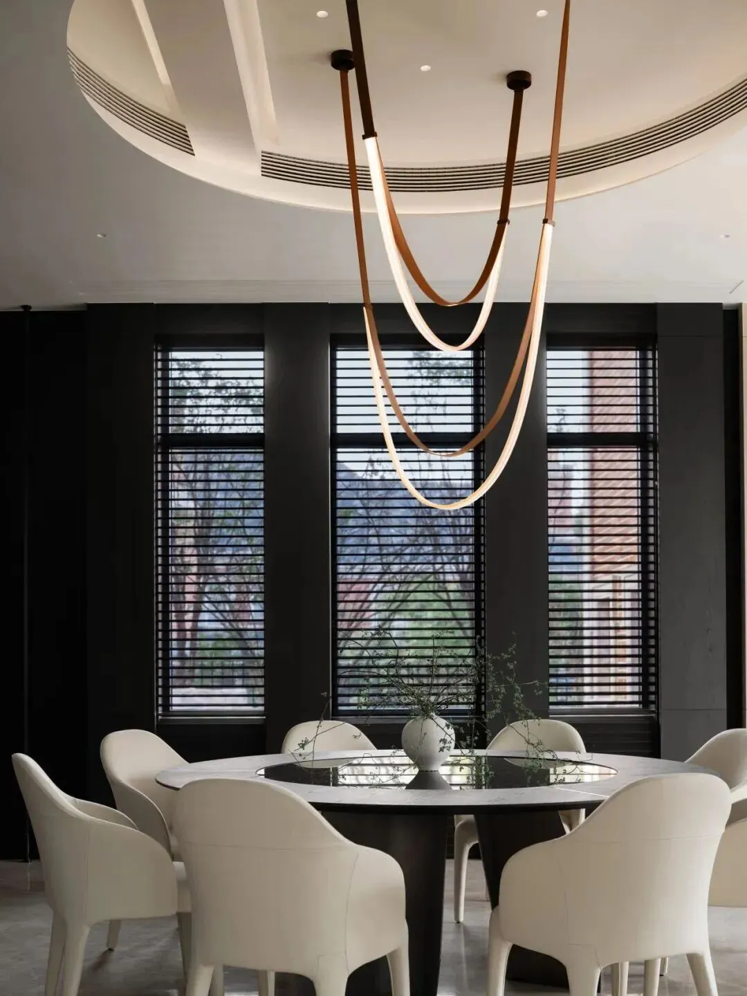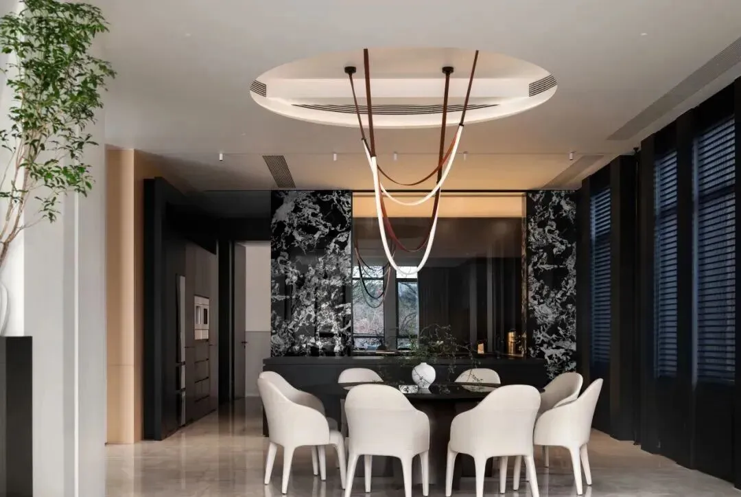 公共社交区强调“通透联动、主次分明”。餐厅与客厅连为一体,形成完整的社交场景。餐厅中央为圆桌,纯白座椅围合出温和的聚餐氛围;顶部的环形灯盘与曲线光带相互交织,暖光洒下,与桌面光影及窗外树影相映。