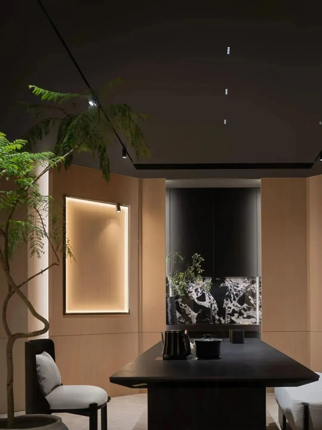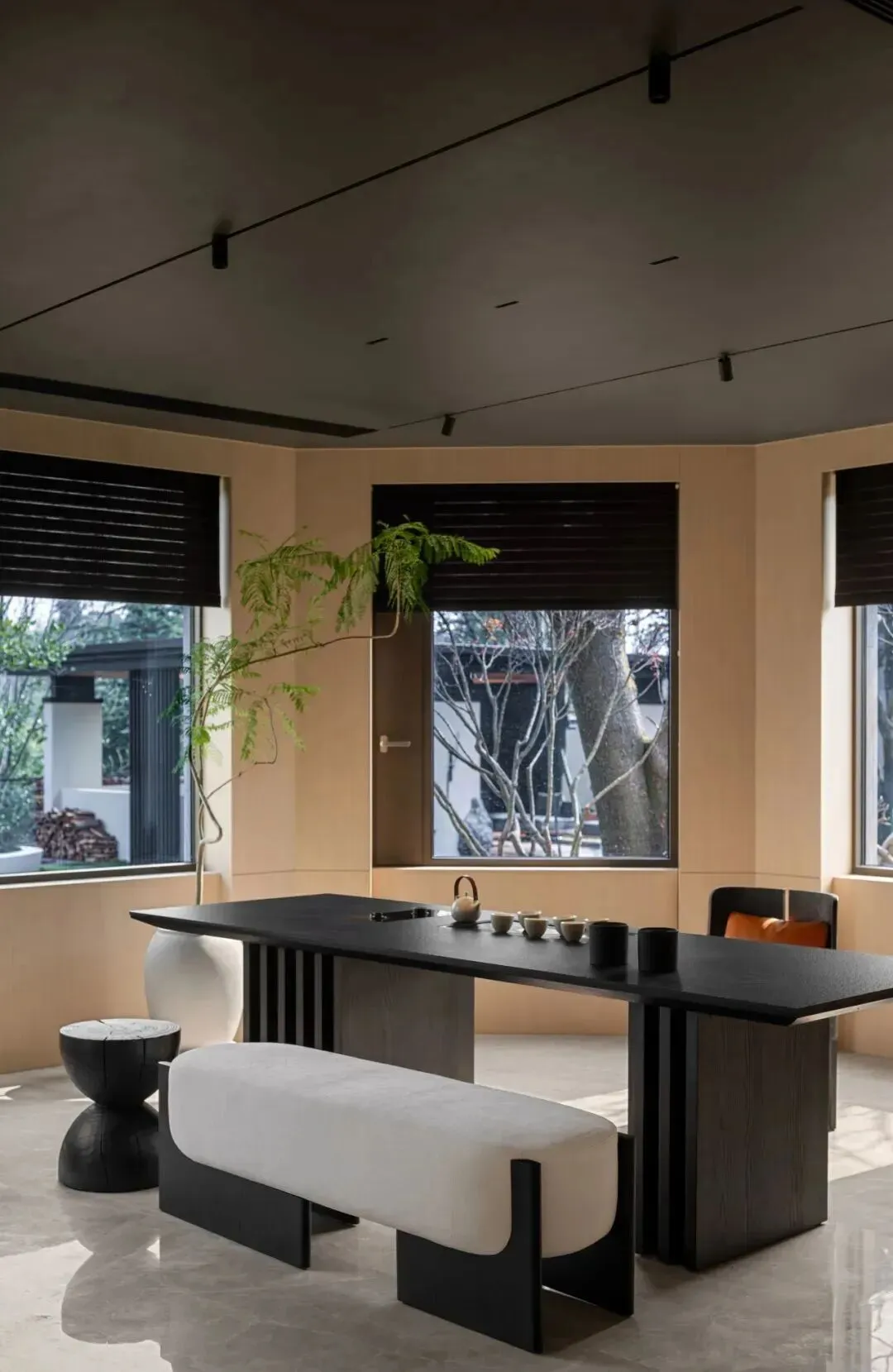 另一处八角形茶室更为温润,木质墙面围合出静谧感,黑色茶台配软包长凳,窗外绿意透过百叶窗洒入,成为品茶与冥想的私密角落。办公区延续极简风格,八边形深色顶面与曲线光带形成强烈视觉反差;整面开放式书架兼顾收纳与展示,书籍和摆件错落有序,保证专注工作的同时不失艺术格调,实现效率与审美的双重满足。