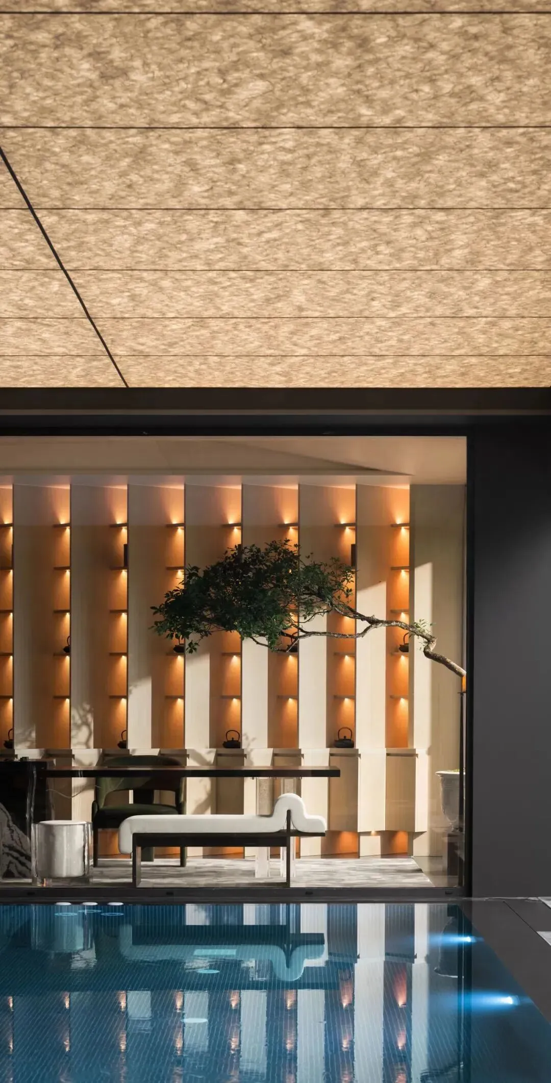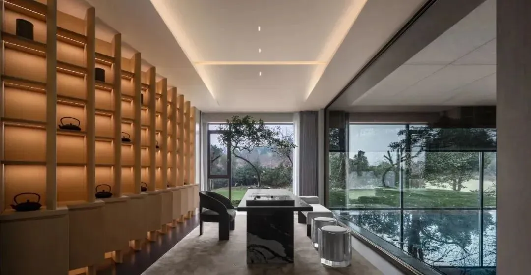 茶歇与办公区体现了东方禅意与当代实用性的平衡。临泳池的茶室以整面竖向格栅为背景,暖光从格栅缝隙漫出;茶台正对庭院和泳池,一株绿植从水面伸展枝叶,水光、灯光与木纹肌理相互辉映,极致演绎“静、空、灵”的东方意境。
