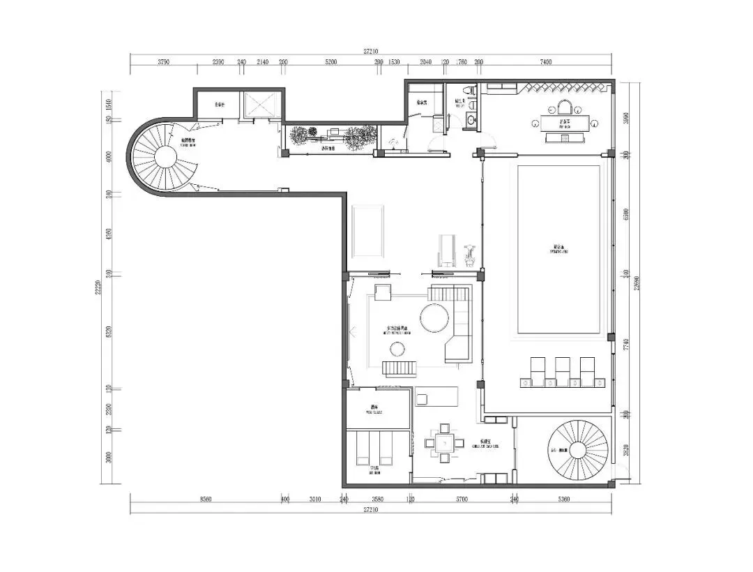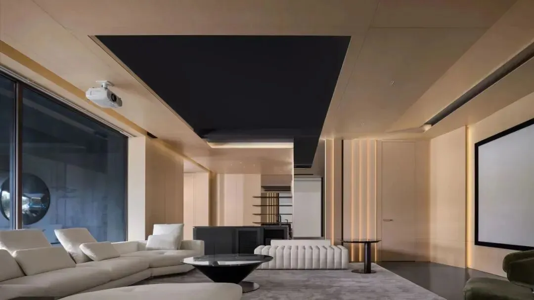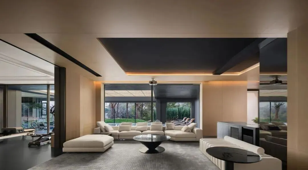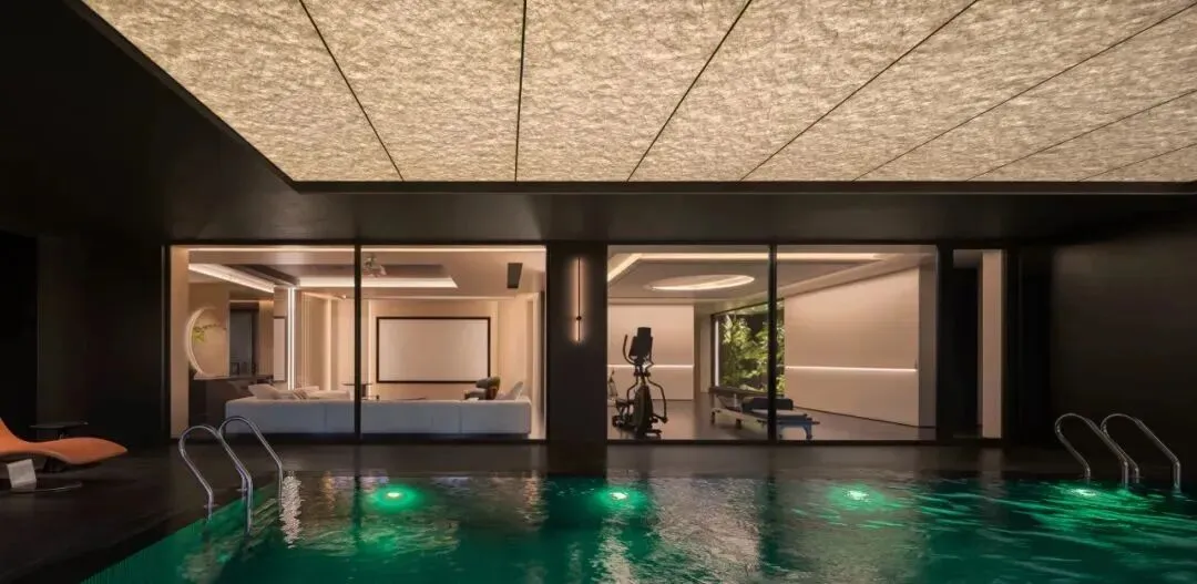 玻璃隔断将泳池区与健身区、影音区串联,既保持通透,又清晰划分功能边界,实现休闲、运动、娱乐的场景联动。光影在水面、墙面与地面之间流动,使每一次休闲活动都充满艺术氛围。
