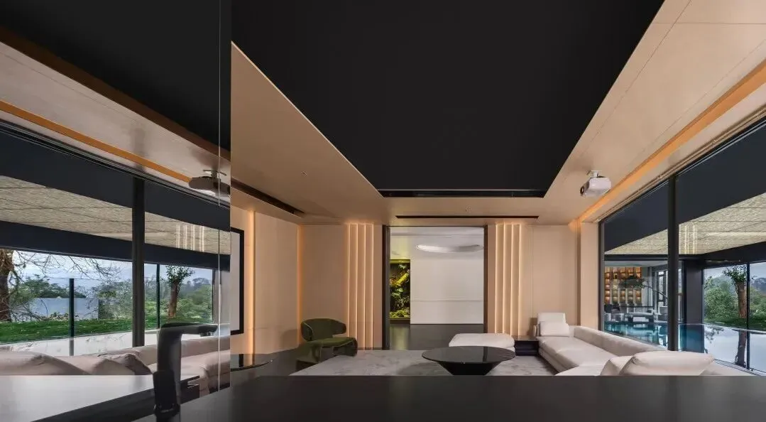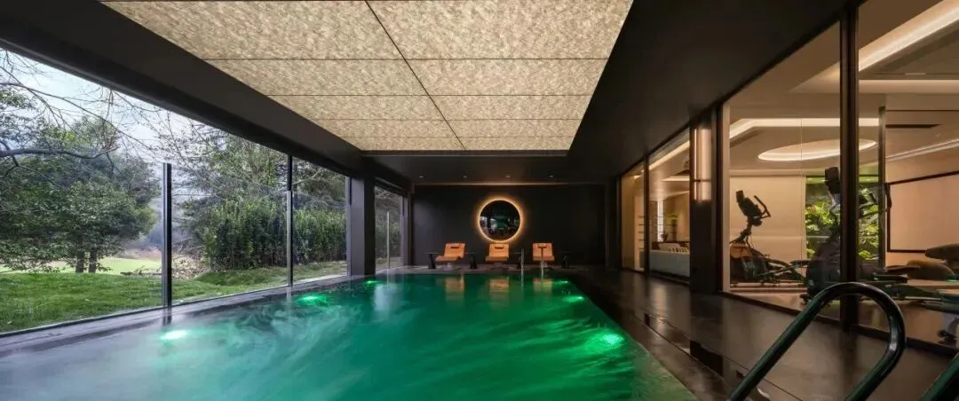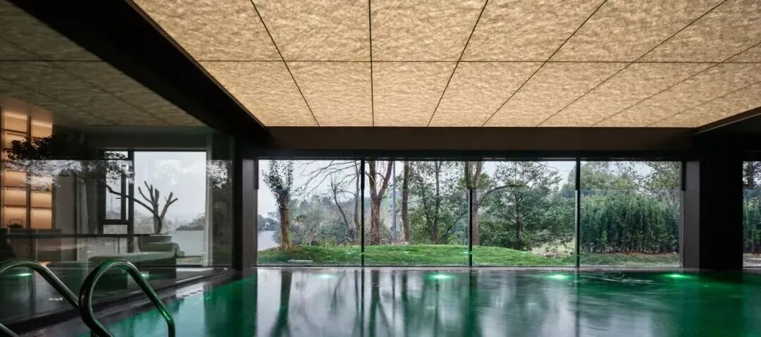休闲娱乐区为宅邸注入活力。泳池区以模块化透光顶面为亮点,暖光透过材质表面漫射,与泳池的碧色水光交相辉映。