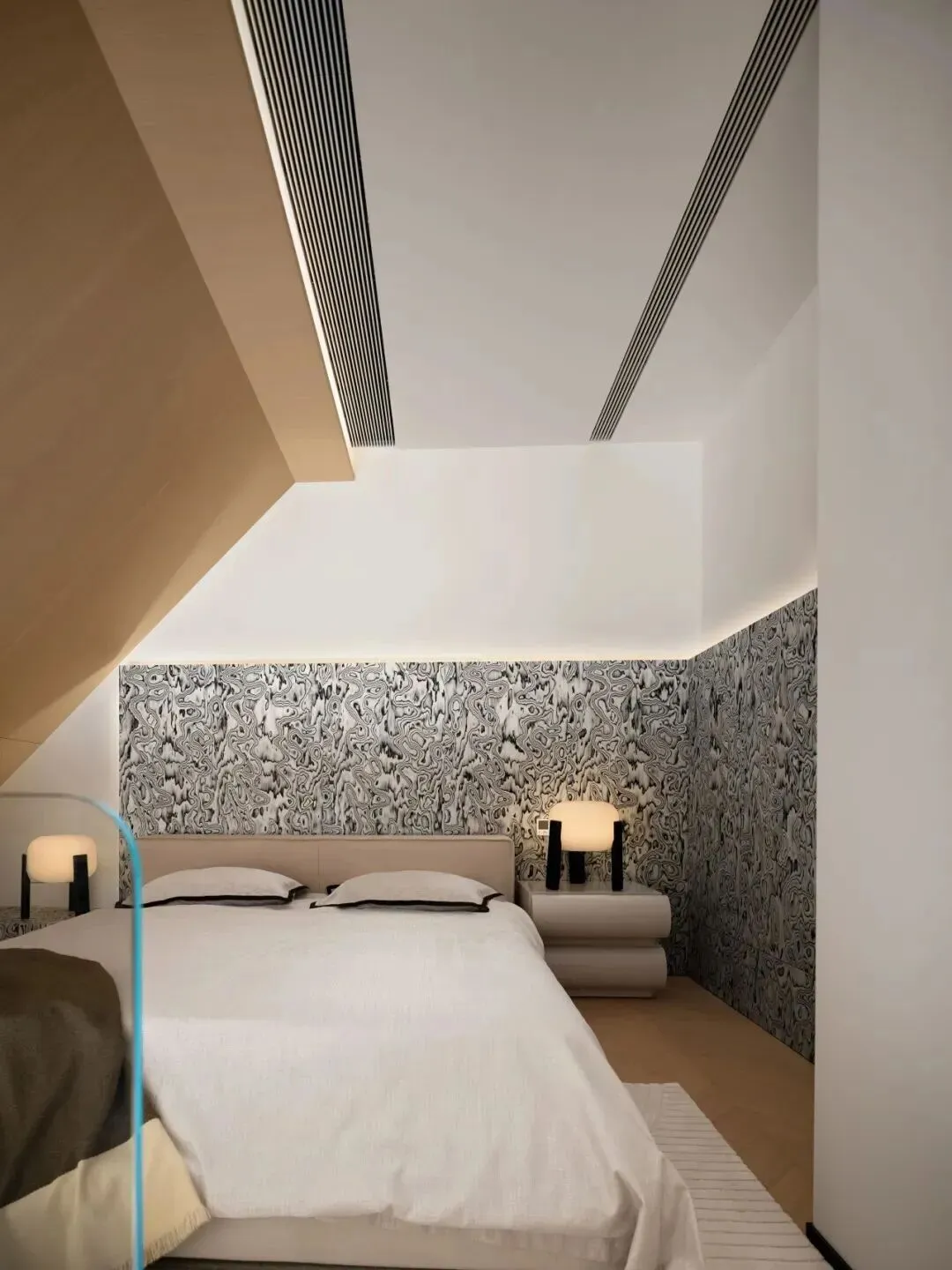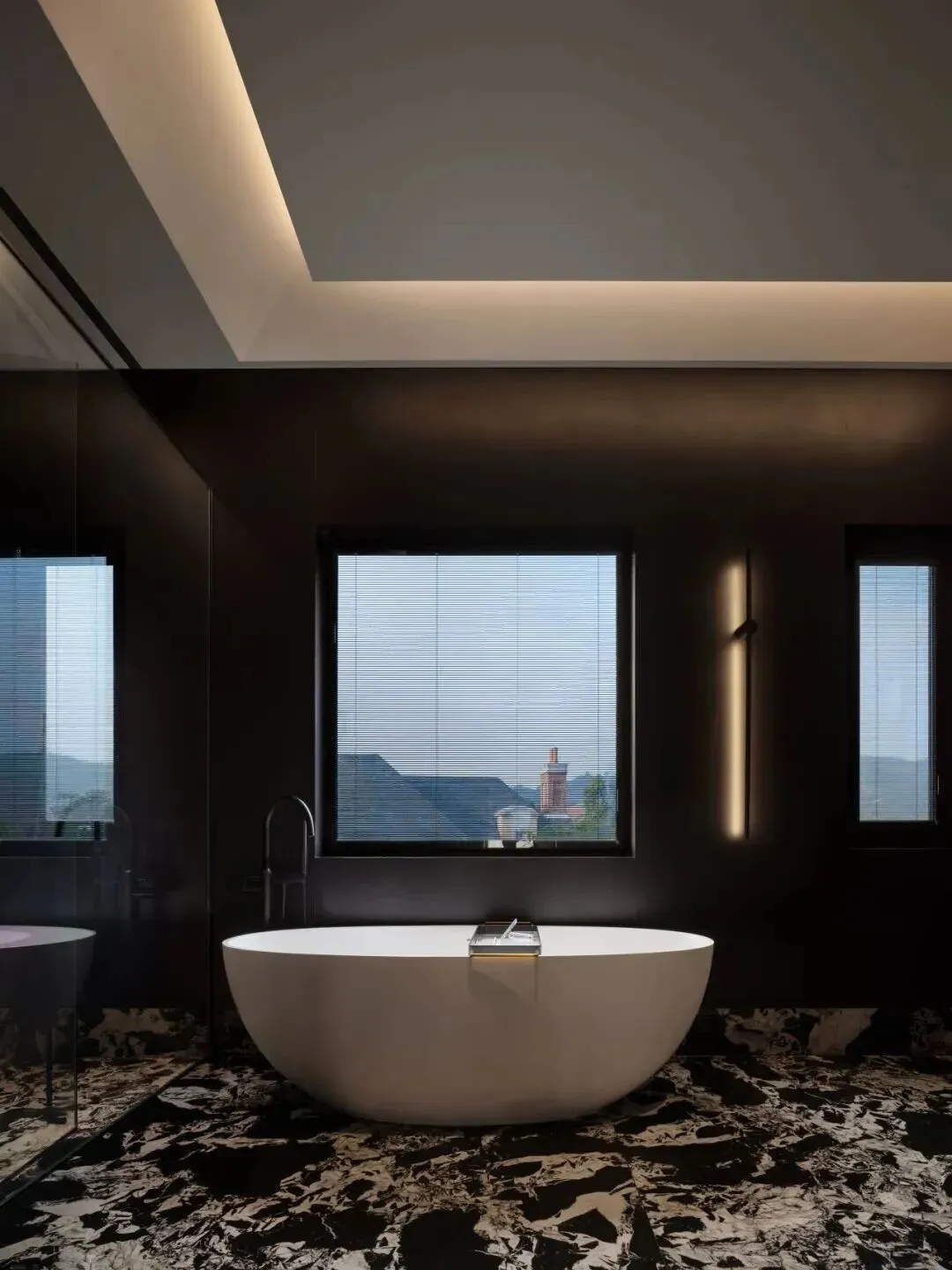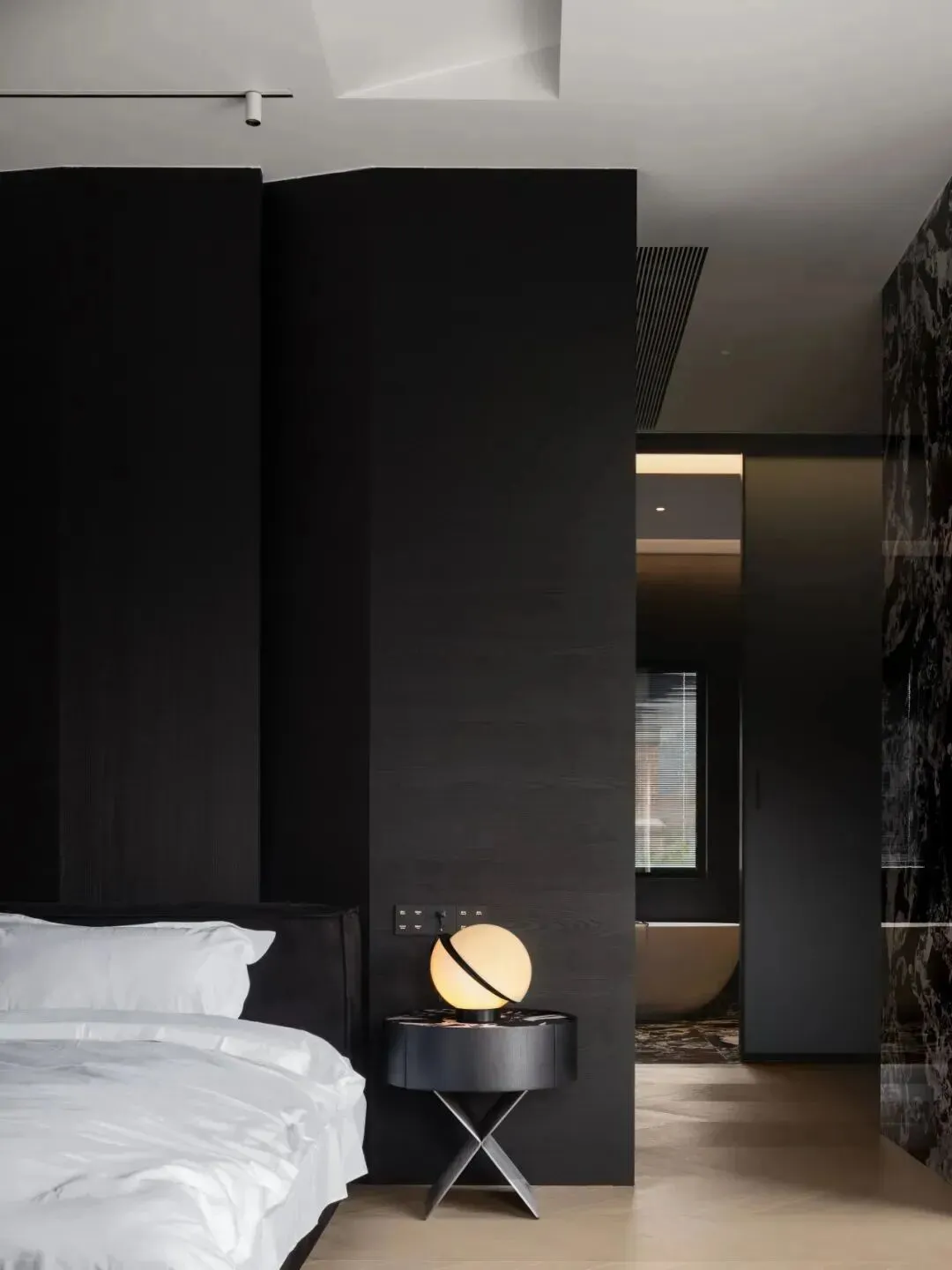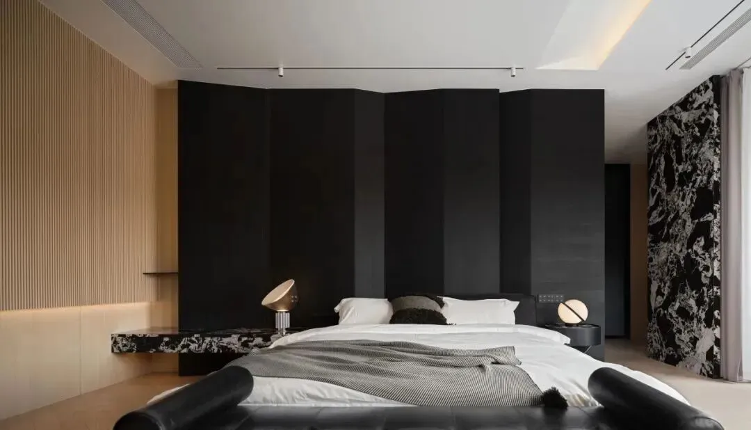 主卧打破常规,床头背景采用深色块面与立体折边设计,赋予空间雕塑感;纯白床品与黑色皮革床尾凳形成冷暖对照,球形台灯的暖光勾勒出温馨边缘。一侧的木质格栅墙面结合内嵌灯带,柔化了深色的厚重感;通过通透隔断直接连通卫浴区,动线流畅。卫浴区以深色为底,搭配黑白纹理地面,独立圆形浴缸临窗而设,窗外景色与柔和灯光交融,打造出松弛而奢华的沐浴体验。