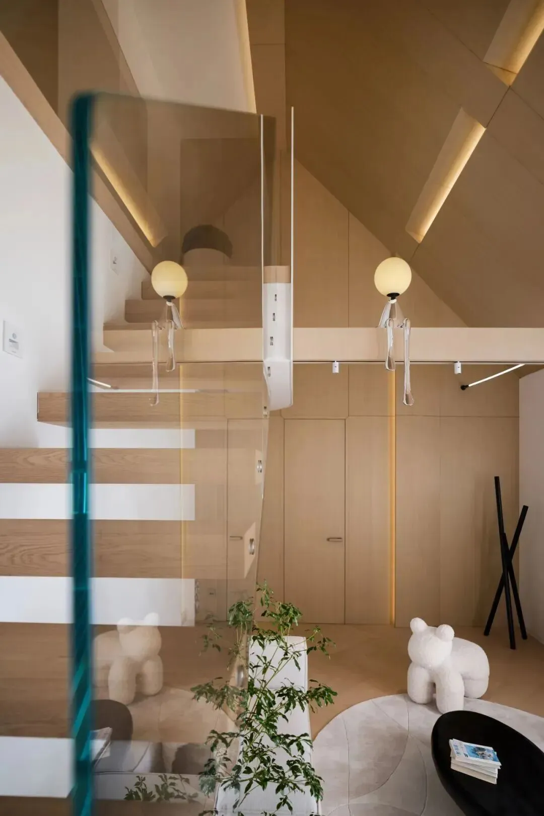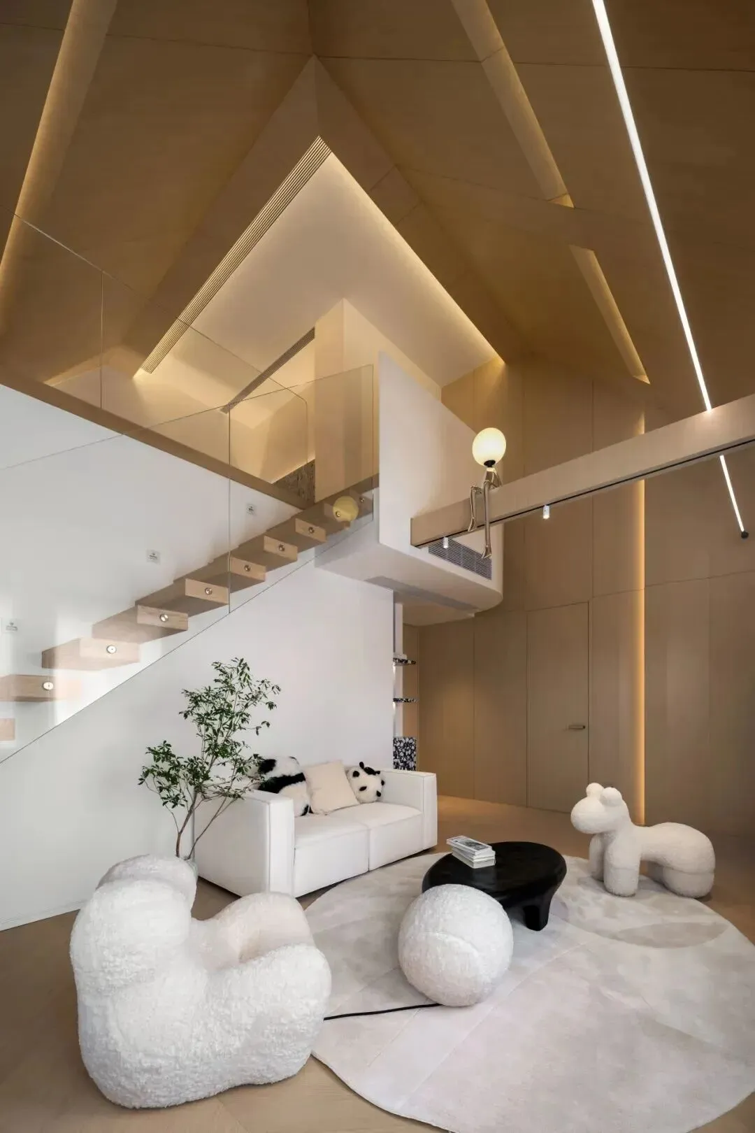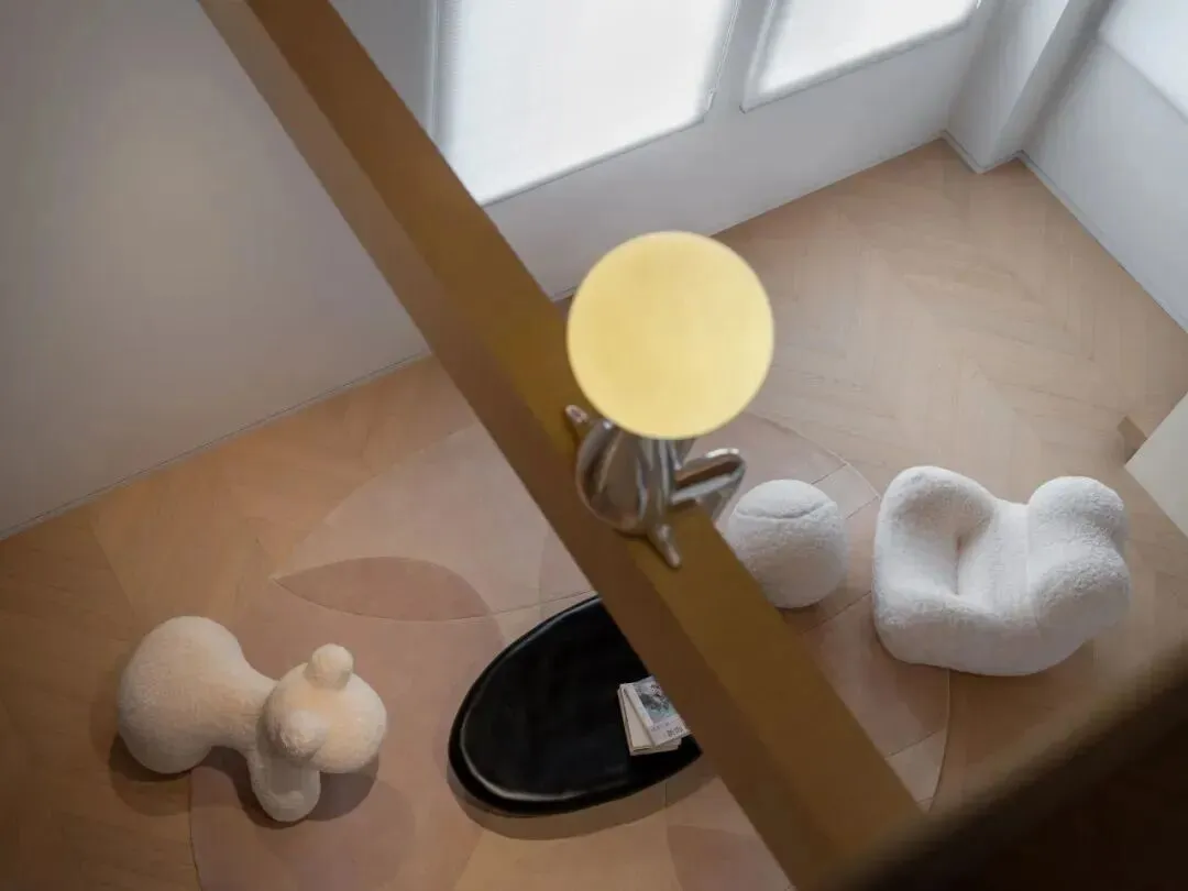 儿童活动区则采用温暖木色为主调,斜顶下线性灯带勾勒建筑轮廓,悬浮楼梯配玻璃护栏,轻盈通透,弱化边界。柔软的毛绒家具、趣味摆件,加上透明隔断,既营造出童趣满满的成长空间,又方便家长随时看护,兼顾安全与趣味。