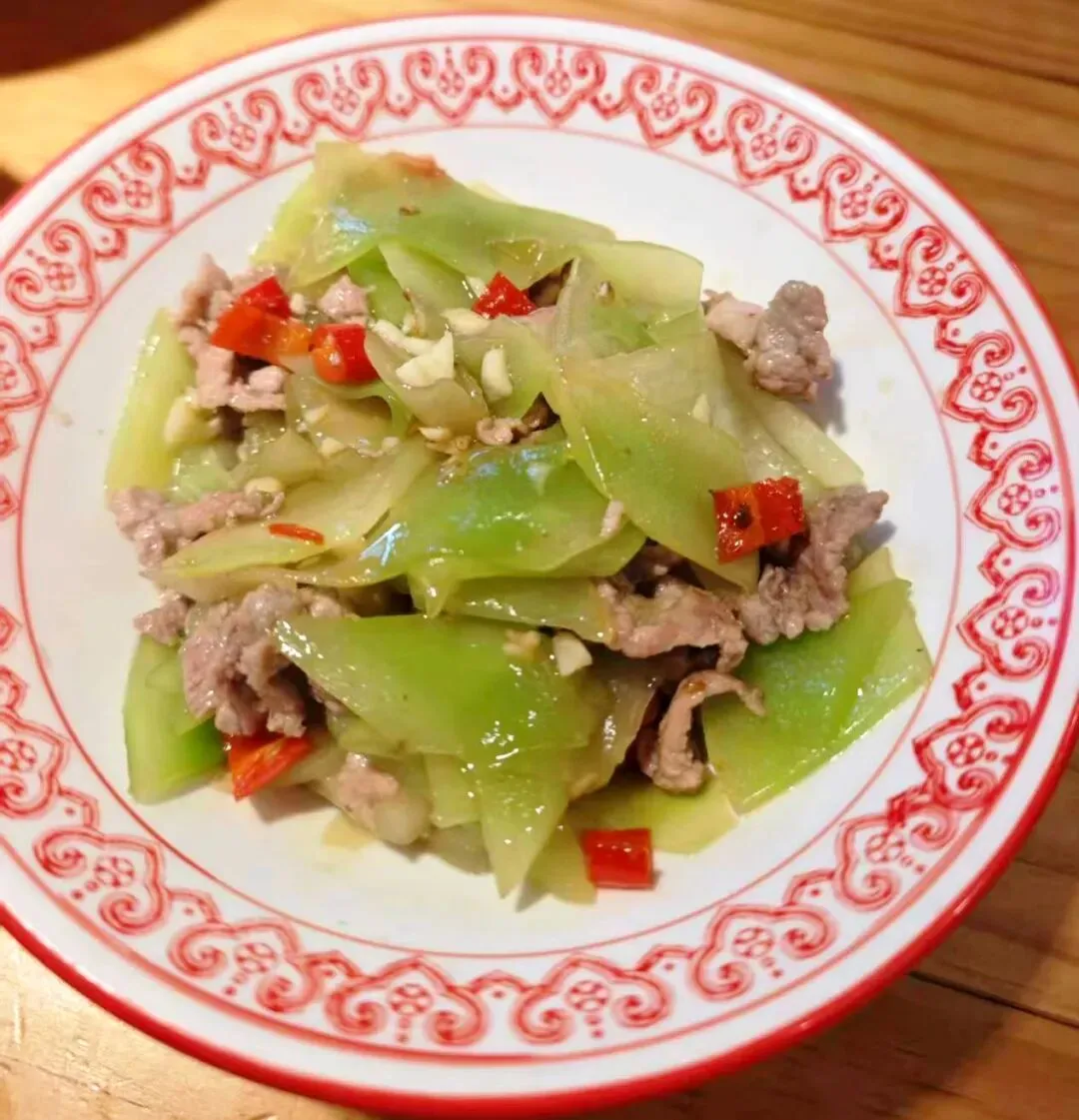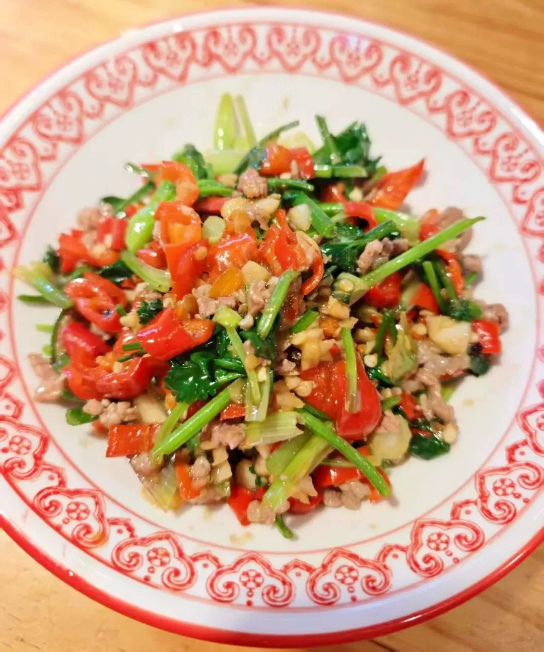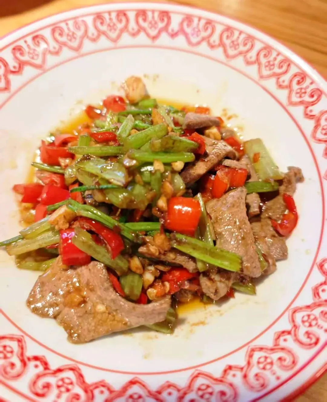 小炒黄牛肉的流行做法,红线椒、小米辣、香菜等配菜较多,牛肉切得细小,占比稍微少了一点点,这道菜鲜辣,香气、味道不错。肉和莴笋都切片,炒莴笋片用了少量辣椒、蒜末调味,没有太多七里八里的配菜,属于轻烹饪了。莴笋清脆爽口,肉片品质差一些。用红线椒、芹菜、蒜米搭配猪肝,大火快炒,烹饪时间短,猪肝片切得随意,香辣入味。少量几根芹菜老了一点,嚼起来有筋。