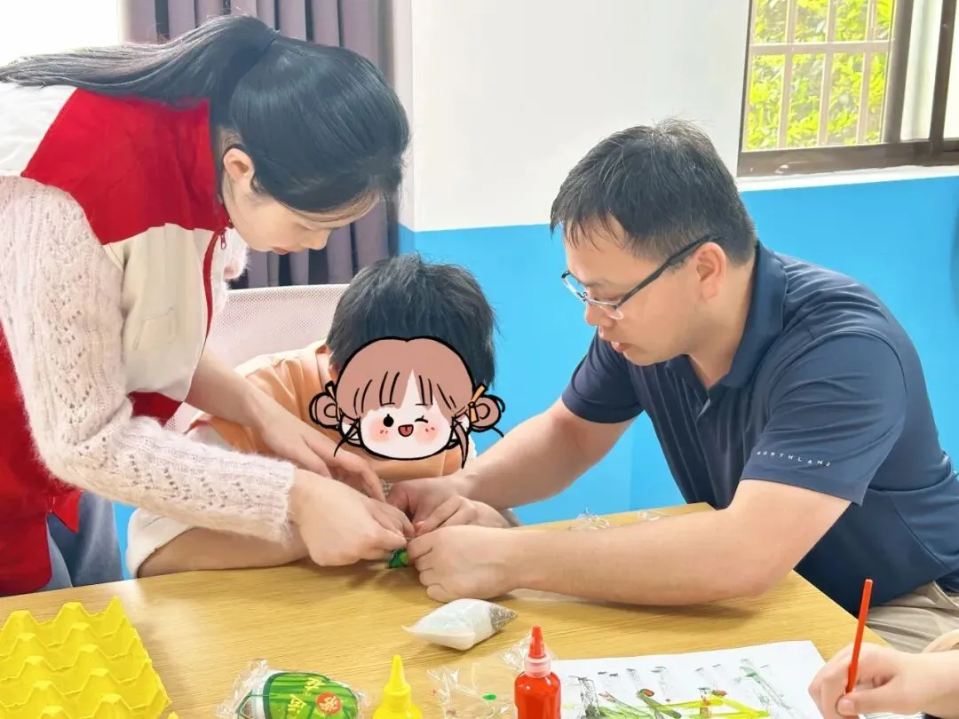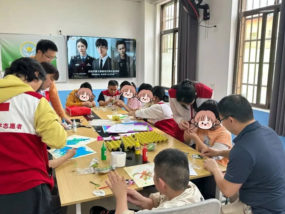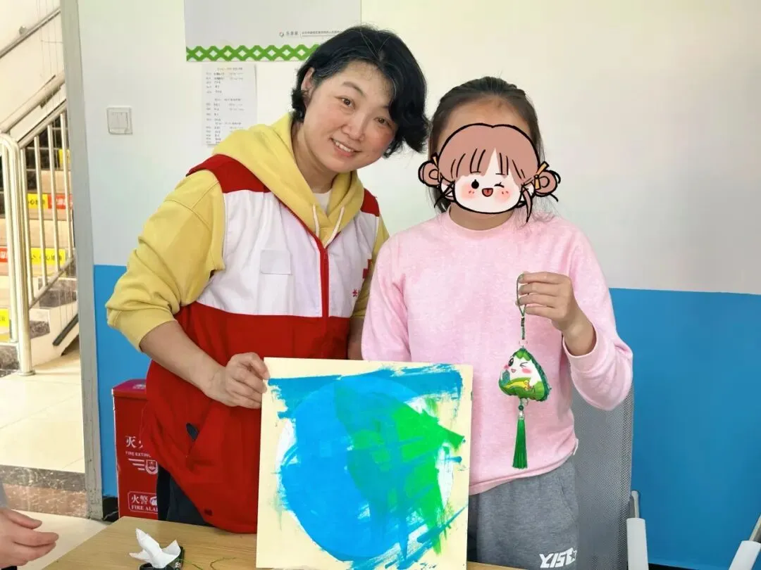 去之前,很多志愿者心里是没底的。有人怕自己不知道怎么跟特殊孩子沟通,有人担心陪玩陪不好反而让孩子不开心。可真到了现场,这些顾虑反而没了。讲课的志愿者反复教、反复带练,恨不得把每个动作都掰开揉碎让家长记住;陪孩子的志愿者就认真坐或站在孩子旁边,一张画纸能夸上好几遍,孩子每往香包里填一勺艾草,他们就跟着说“真厉害”“手好巧”。