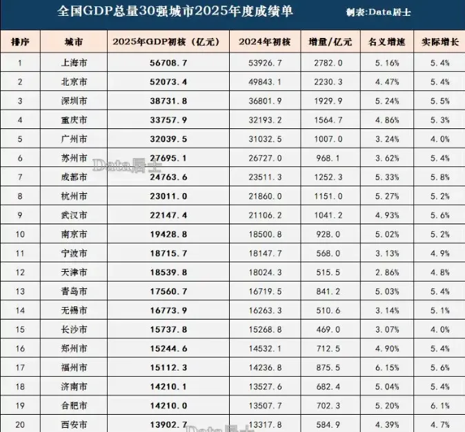 2025年全国城市GDP榜单,清晰勾勒出长沙与十强的鸿沟。上海、北京突破5万亿,深圳、重庆、广州超3万亿,苏州、成都、杭州、武汉跻身2万亿俱乐部,南京以19428.78亿元成为十强“守门员”。而长沙GDP仅15737.82亿元,排名第15位,与南京相差近3700亿元,与武汉、成都等中部强市差距超5000亿元。