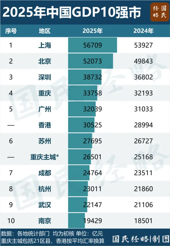 而作为早已迈入千万人口俱乐部的长沙,2025年GDP仅1.57万亿元,全国排名第15位,与十强门槛存在近4000亿元的巨大鸿沟。当人口规模优势不再能转化为经济总量优势,当产业结构面临传统支柱与新兴力量的博弈,城市竞争从增量扩张转向存量提质,长沙距离全国城市十强,究竟还有多远?