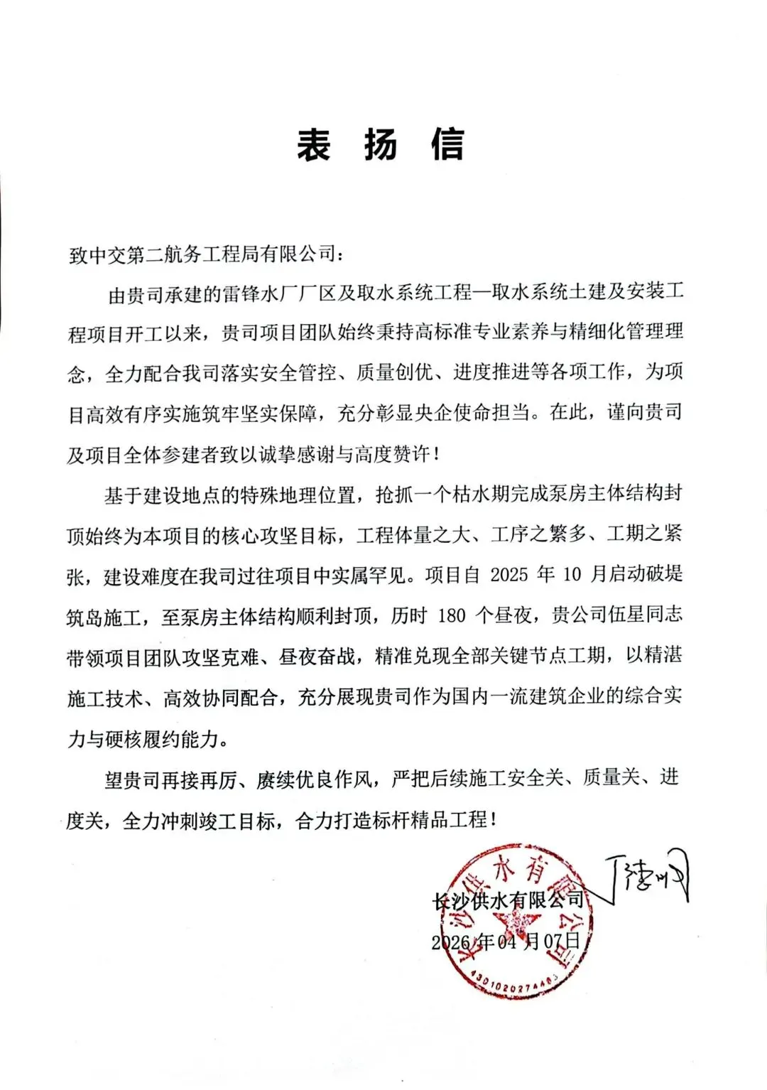 长沙供水有限公司在表扬信中表示,希望中交二航局继续发扬优良作风,严把后续施工的安全、质量、进度关,全力冲刺竣工目标,合力将雷锋水厂项目打造成为标杆精品工程。