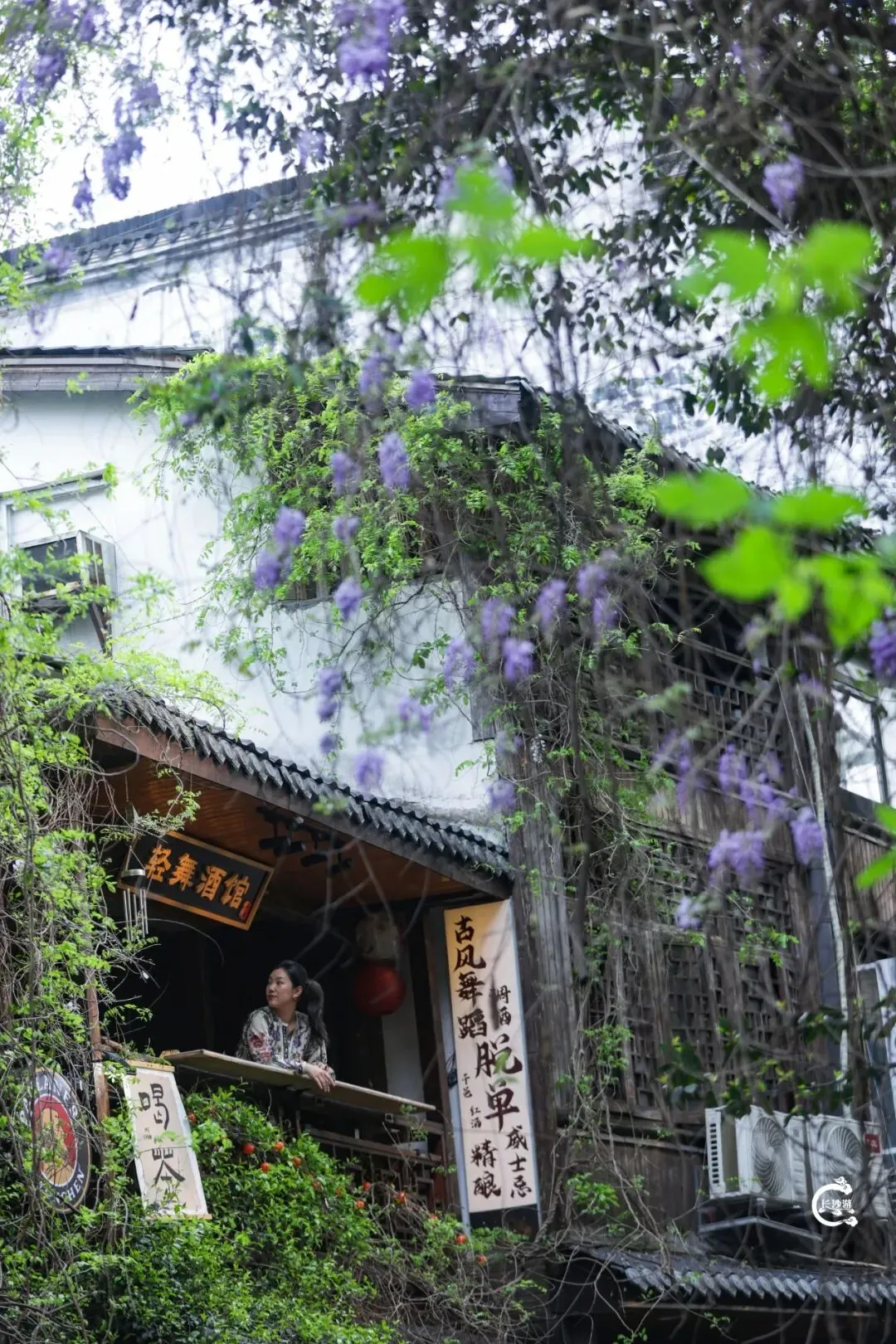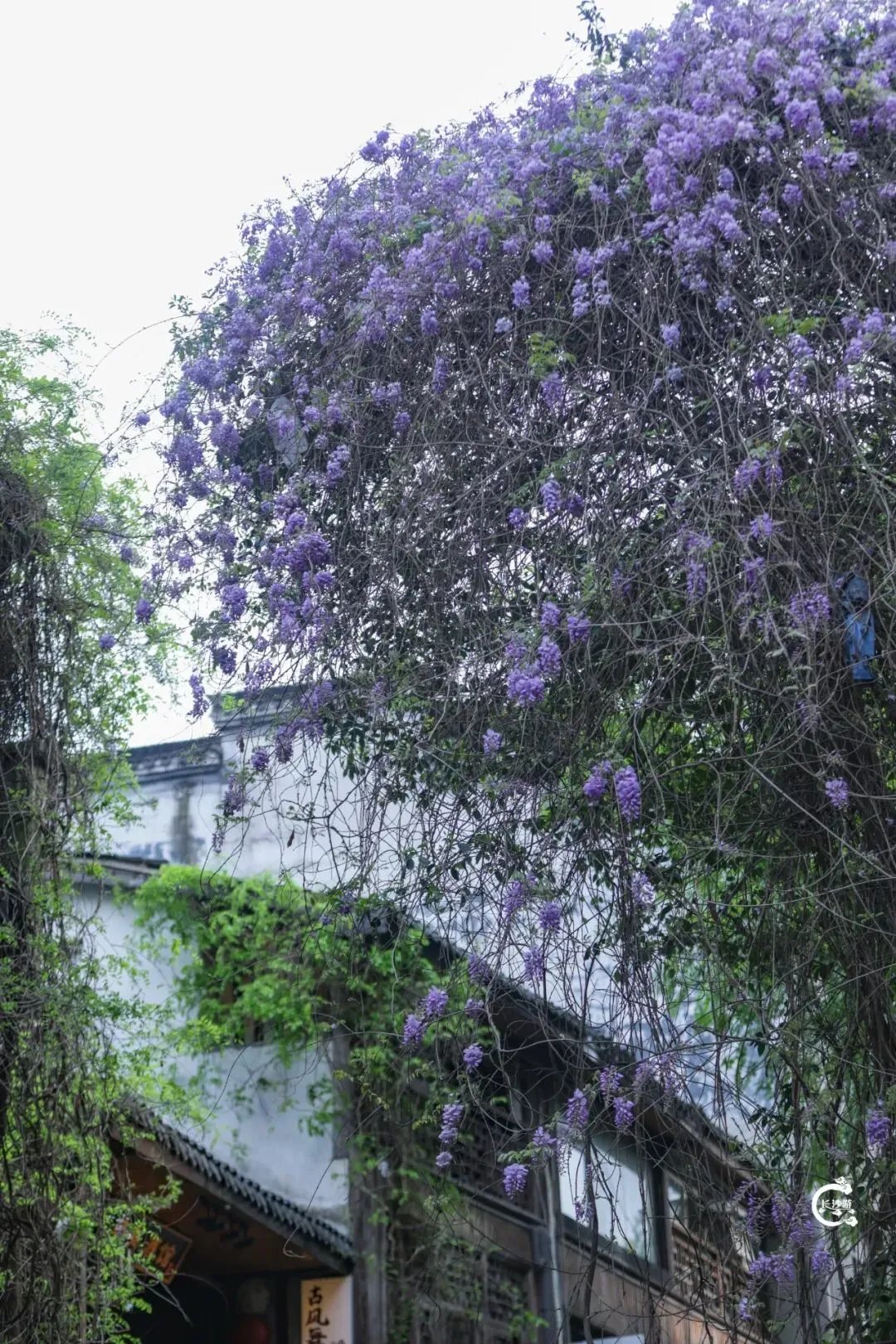 小小的缺点大概就是,这里的紫藤长得比较高,想拍人像特写有些难度,但若是拍远景、氛围感照片,绝对不会让人失望——让紫藤花作为背景,搭配老街的清代建筑风貌,氛围感直接拉满,随手就能拍出文艺大片。