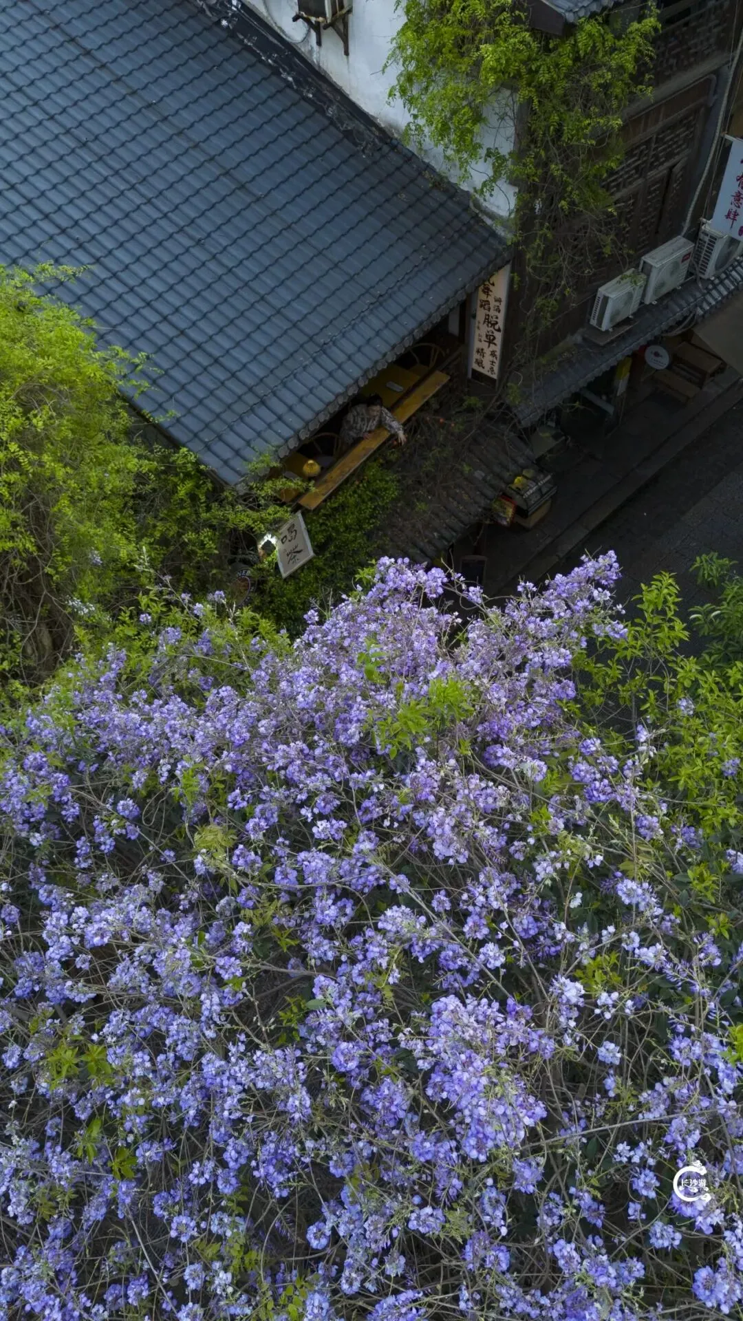 说起白果园,大多人想起的是民国公馆的底蕴、麻石路的复古,却少有人知道,程潜公馆左侧的巷子里,藏着一处“紫藤秘境”——叶时茶馆那栋楼,早已被紫藤花温柔包裹。