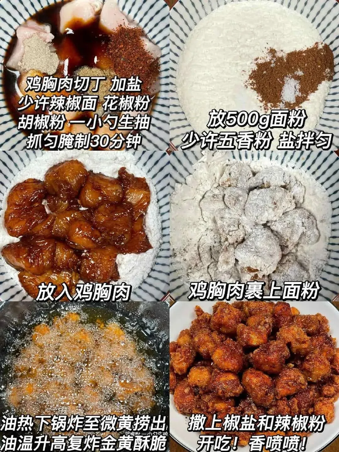 食材准备 主料:鸡胸肉 一块(大概500g就行),面粉,辣椒面、花椒粉、胡椒粉、五香粉,调料:盐、生抽、椒盐、料酒料酒 准备工作 鸡胸肉切成2厘米左右的小丁,放1~2勺盐,少许辣椒面,胡椒粉,一勺生抽,料酒料酒,抓匀腌制25--30分钟就行,对了一定要多抓一会儿让肉都浸满料汁,不然里面没味道就不好吃了