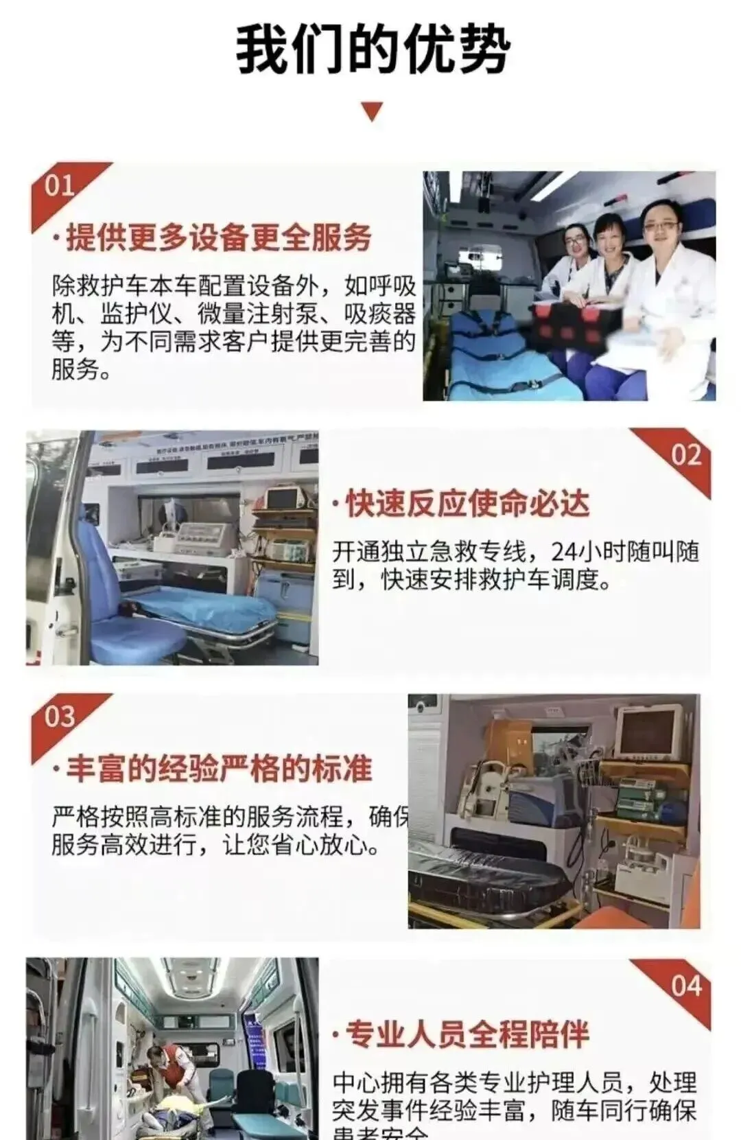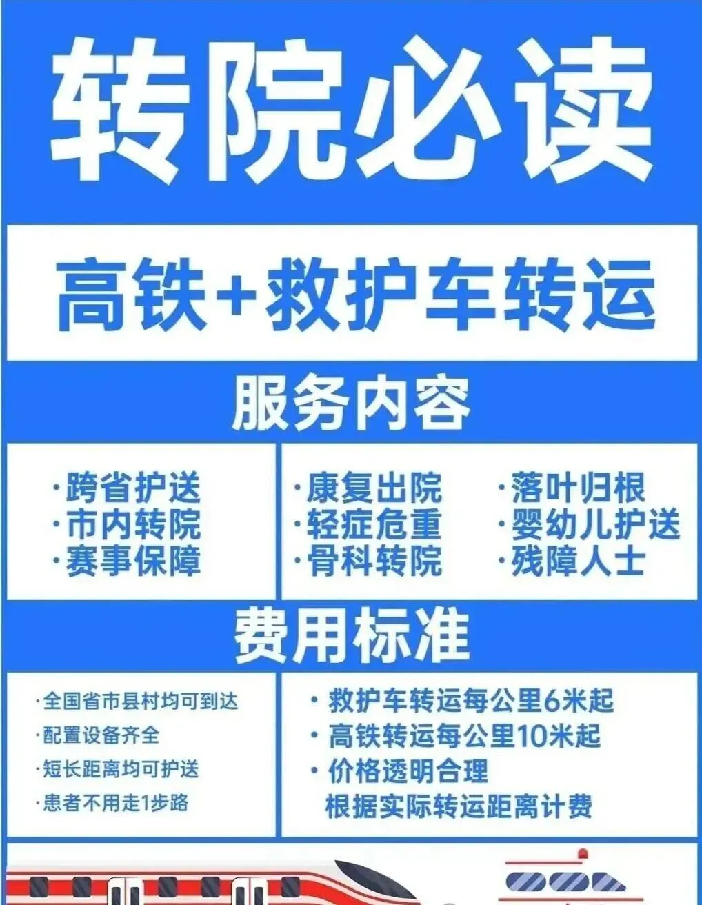 - 24小时全天候服务,全年无休,随时响应紧急转运与预约转运;- 价格公开透明,无隐形消费,根据转运距离、车辆配置合理定价; 市内短途(出院 / 转院)普通转运:600–800 元起(含 10 公里内);超出后8–10 元 / 公里监护型(含医护 / 基础设备):800–1200 元起附加:进高铁站 / 火车站 +200 元 长途跨省(按里程)重症监护(呼吸机 / 医护):10–18 元 / 公里- 正规资质保障,车辆与人员均符合医疗转运标准,手续齐全,安全可信赖;- 服务灵活贴心,可根据患者病情定制个性化转运方案,全程人性化陪护预约与联系
