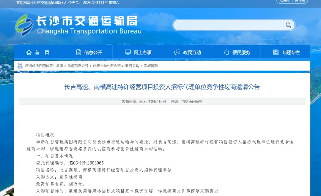 近日,备受瞩目的长吉高速公路长沙至安化段项目传来新动向。4月10日,长沙市交通运输局官网发布《长吉高速、南横高速特许经营项目投资人招标代理单位竞争性磋商邀请公告》,正式启动投资人招标代理单位的采购工作,项目最高预算金额40万元,采购文件的获取时间截至4月17日。