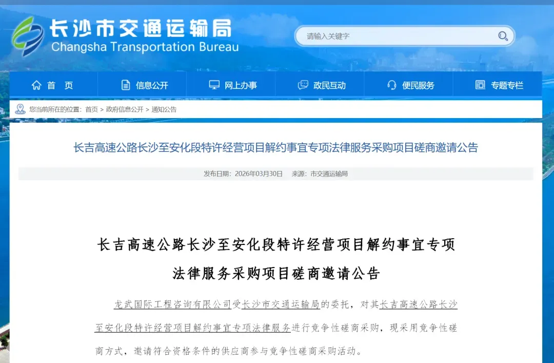 回看这一重大项目的推进历程,可谓一波三折。早在2024年12月26日,长吉高速长沙至安化段便在宁乡举行了隆重的开工仪式,当时以中铁交通投资集团为牵头方的联合体成功中标,项目建设期4年,建成后将惠及沿线百多万群众,直接带动宁乡中西部乡镇及安化沿线区域的发展。然而,进入2026年3月,项目因特许经营模式下的合同履行问题启动了解约程序。3月30日,长沙市交通运输局发布公告,采购专项法律服务以推进解约事宜。这一消息一度引发外界对项目进度的担忧。但从最新的招标公告来看,解约并未导致项目停摆,恰恰相反,解约是为了更规范、更高效地重启。