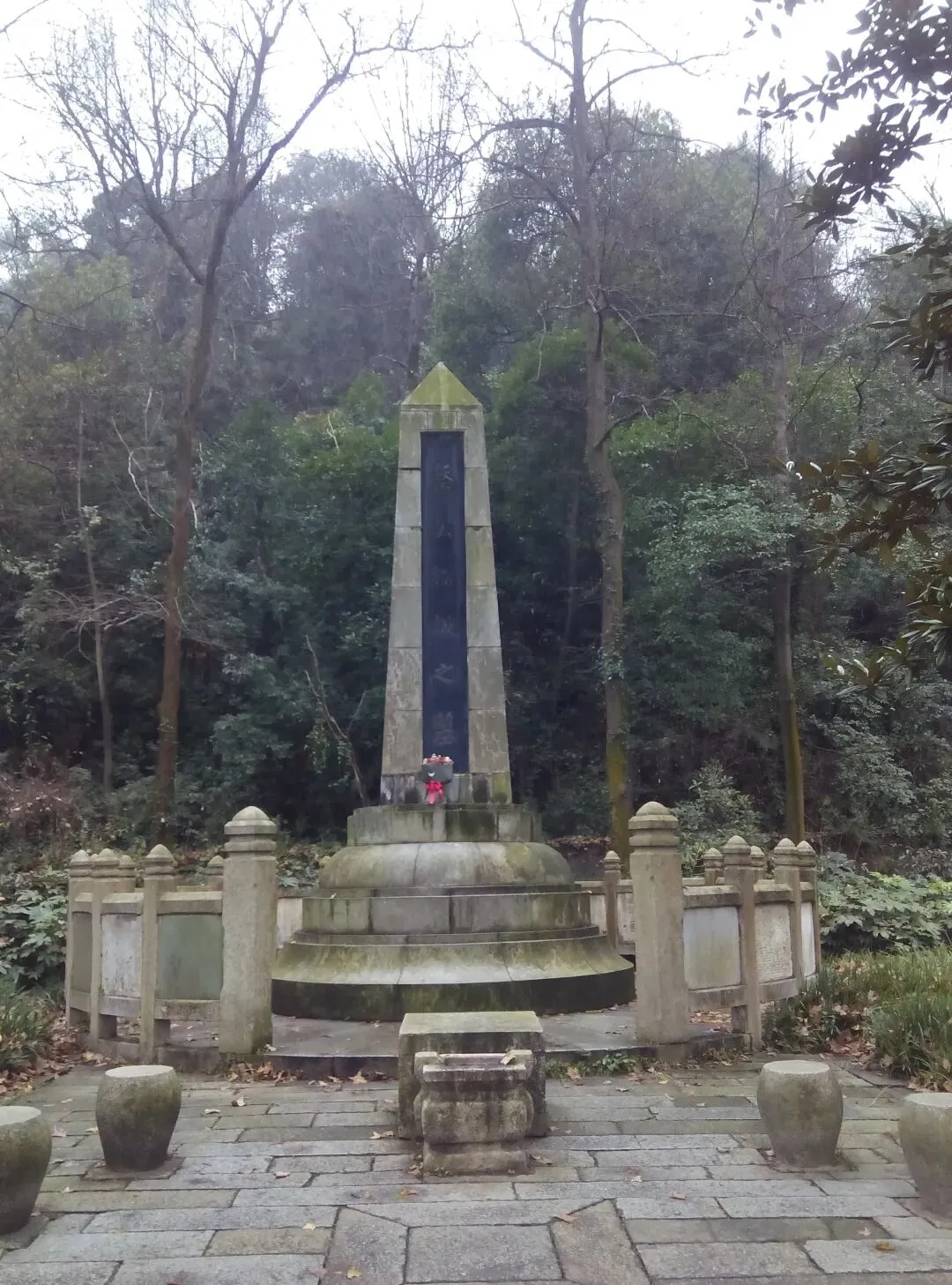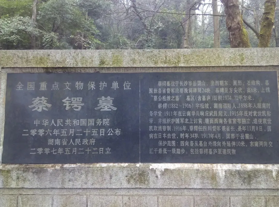 从爱晚亭继续往上,便到了蔡锷墓。墓不算大,石砌的,掩映在苍松翠柏之间,安静得让人不忍高声。我在墓前站了一会儿。蔡锷三十四岁就走了,人生虽短,却做了惊天动地的事。想起他那句“为四万万人争人格”,心里忽然有些发紧。这样的年纪,这样的抱负,如今还有多少人记得?雨打在松针上,沙沙的,像是有人在低语。